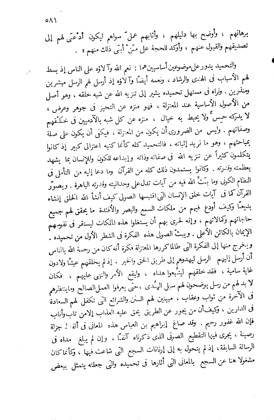 ويخرج منها إلى الفكرة التى طالما كررها المعتزلة فكرة أنه كان من رحمة الله بالناس أن أرسل إليهم الرسل ليهدوهم إلى طريق الحق والخير، إذ لم يخلقهم عبثا ولا دون غاية سامية، فقد خلقهم ليتّبعوا هداه، وليقع الأمر والنهى عليهم، فكان لا بد لهم من رسل يوضحون لهم سبل الهدى، حتى يعرفوا العمل الصالح وما ينتظرهم فى الآخرة من ثواب وعقاب، مبينين لهم السنن والشرائع التى تكفل لهم السعادة فى الدارين، وكيف أن من يجور عن الطريق يحق عليه العذاب إلا من تاب وأناب فإن الله غفور رحيم. وقد صاغ إبراهيم بن العباس هذه المعانى فى ألفاظه جزلة رصينة، يجرى فيها التقطيع الصوتى الذى ذكرناه آنفا، وإن لم يبلغ مداه فى الرسالة السابقة، إذ لم يتحول به إلى إرنانات السجع التى شاعت فيها، وكأنما كان مشغولا هنا عن السجع بالمعانى التى أثارها فى تحميده والتى جعلته يتمثل ببعض