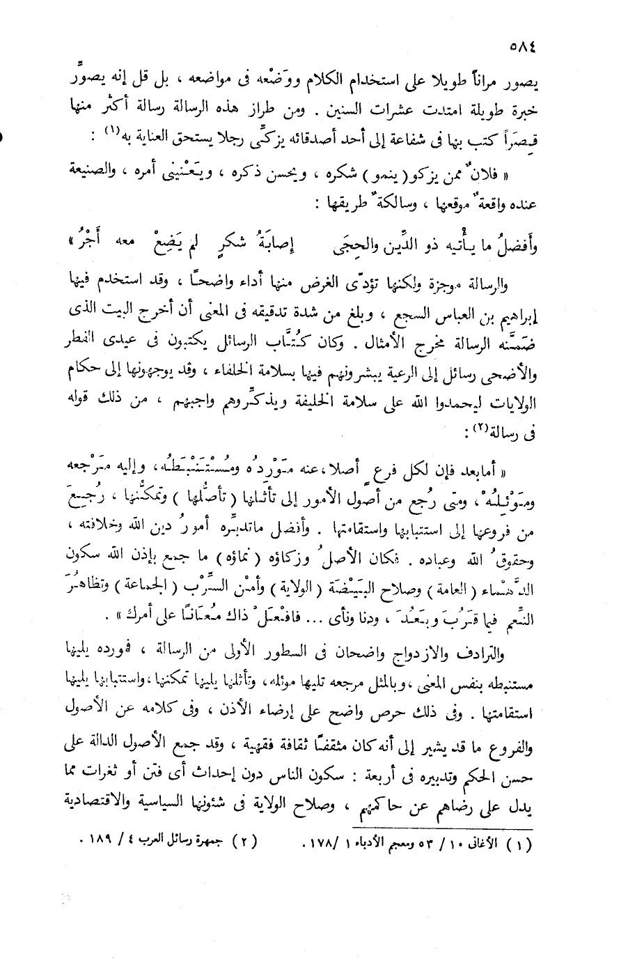 يصور مرانا طويلا على استخدام الكلام ووضعه فى مواضعه، بل قل إنه يصوّر خبرة طويلة امتدت عشرات السنين. ومن طراز هذه الرسالة رسالة أكثر منها قصرا كتب بها فى شفاعة إلى أحد أصدقائه يزكّى رجلا يستحق العناية به (¬1):