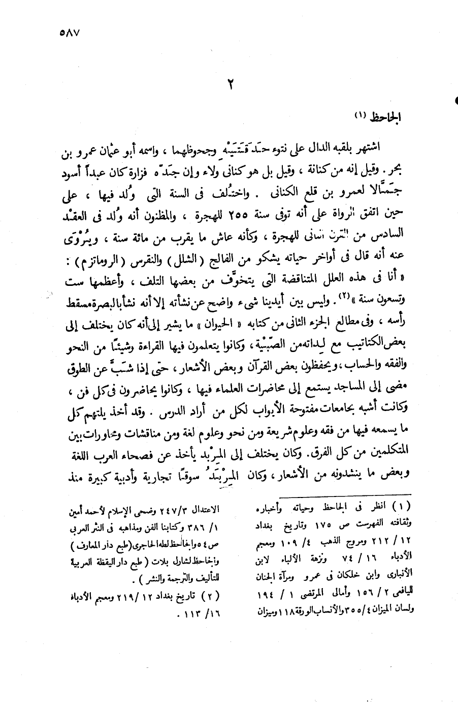 (¬1) انظر فى الجاحظ وحياته وأخباره وثقافته الفهرست ص 175 وتاريخ بغداد 12/ 212 ومروج الذهب 4/ 109 ومعجم الأدباء 16/ 74 ونزهة الألباء لابن الأنبارى وابن خلكان فى عمرو ومرآة الجنان لليافعى 2/ 156 وأمالى المرتضى 1/ 194 ولسان الميزان 4/ 355 والأنساب الورقة 118 وميزان الاعتدال 3/ 247 وضحى الإسلام لأحمد أمين 1/ 386 وكتابنا الفن ومذاهبه فى النثر العربى ص 54 والجاحظ لطه الحاجرى (طبع دار المعارف) والجاحظ لشارل بلات (طبع دار اليقظة العربية للتأليف والترجمة والنشر).