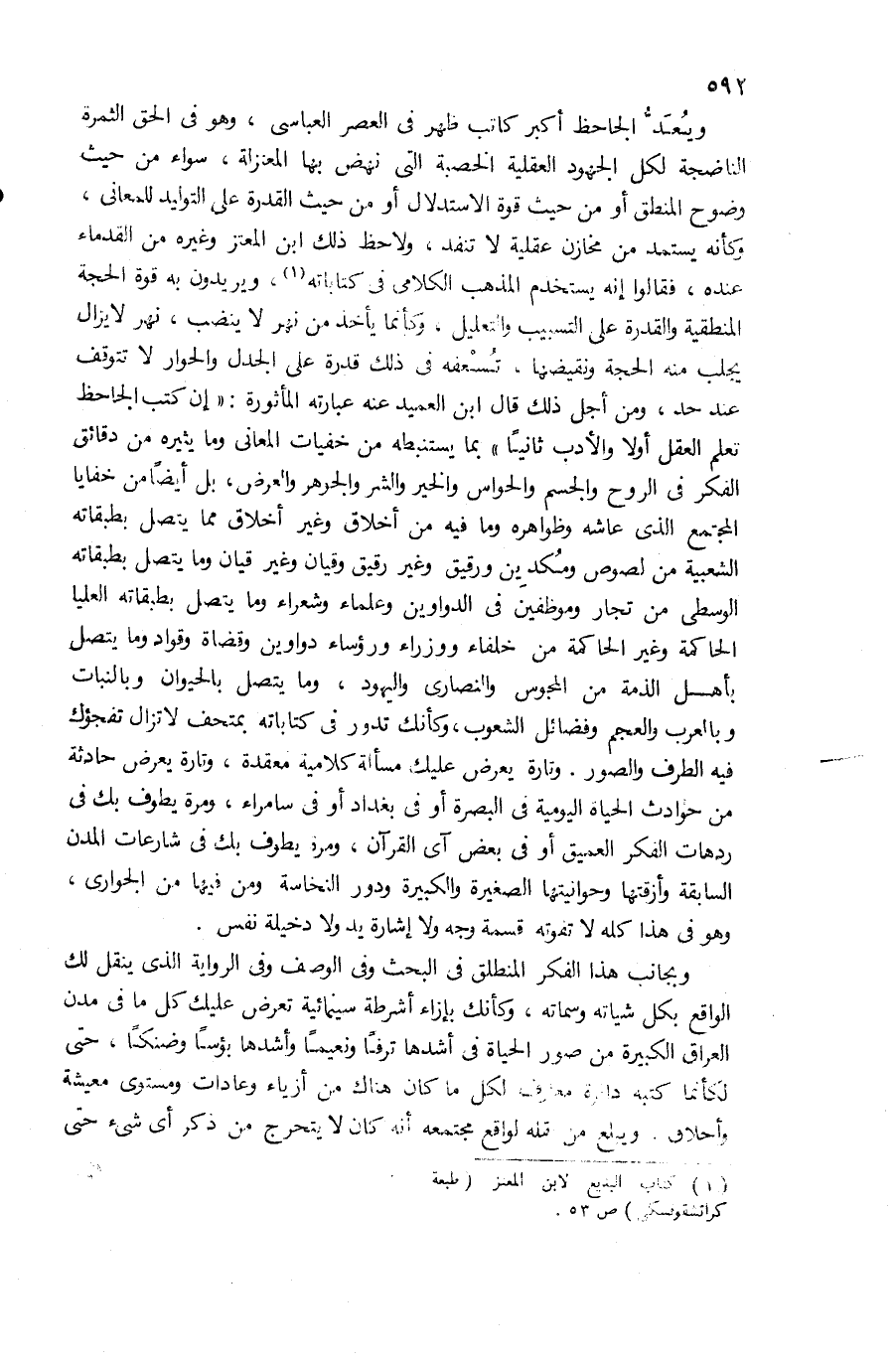 ويعدّ الجاحظ أكبر كاتب ظهر فى العصر العباسى، وهو فى الحق الثمرة الناضجة لكل الجهود العقلية الخصبة التى نهض بها المعتزلة، سواء من حيث وضوح المنطق أو من حيث قوة الاستدلال أو من حيث القدرة على التوليد للمعانى، وكأنه يستمد من مخازن عقلية لا تنفد، ولاحظ ذلك ابن المعتز وغيره من القدماء عنده، فقالوا إنه يستخدم المذهب الكلامى فى كتاباته (¬1)، ويريدون به قوة الحجة المنطقية والقدرة على التسبيب والتعليل، وكأنما يأخذ من نهر لا ينضب، نهر لا يزال يجلب منه الحجة ونقيضها، تسعفه فى ذلك قدرة على الجدل والحوار لا تتوقف عند حد، ومن أجل ذلك قال ابن العميد عنه عبارته المأثورة: «إن كتب الجاحظ تعلم العقل أولا والأدب ثانيا» بما يستنبطه من خفيات المعانى وما يثيره من دقائق الفكر فى الروح والجسم والحواس والخير والشر والجوهر والعرض، بل أيضا من خفايا المجتمع الذى عاشه وظواهره وما فيه من أخلاق وغير أخلاق مما يتصل بطبقاته الشعبية من لصوص ومكدين ورقيق وغير رقيق وقيان وغير قيان وما يتصل بطبقاته الوسطى من تجار وموظفين فى الدواوين وعلماء وشعراء وما يتصل بطبقاته العليا الحاكمة وغير الحاكمة من خلفاء ووزراء ورؤساء دواوين وقضاة وقواد وما يتصل بأهل الذمة من المجوس والنصارى واليهود، وما يتصل بالحيوان وبالنبات وبالعرب والعجم وفضائل الشعوب، وكأنك تدور فى كتاباته بمتحف لا تزال تفجؤك فيه الطرف والصور. وتارة يعرض عليك مسألة كلامية معقدة، وتارة يعرض حادثة من حوادث الحياة اليومية فى البصرة أو فى بغداد أو فى سامراء، ومرة يطوف بك فى ردهات الفكر العميق أو فى بعض آى القرآن، ومرة يطوف بك فى شارعات المدن السابقة وأزقتها وحوانيتها الصغيرة والكبيرة ودور النخاسة ومن فيها من الجوارى، وهو فى هذا كله لا تفوته قسمة وجه ولا إشارة يد ولا دخيلة نفس.
