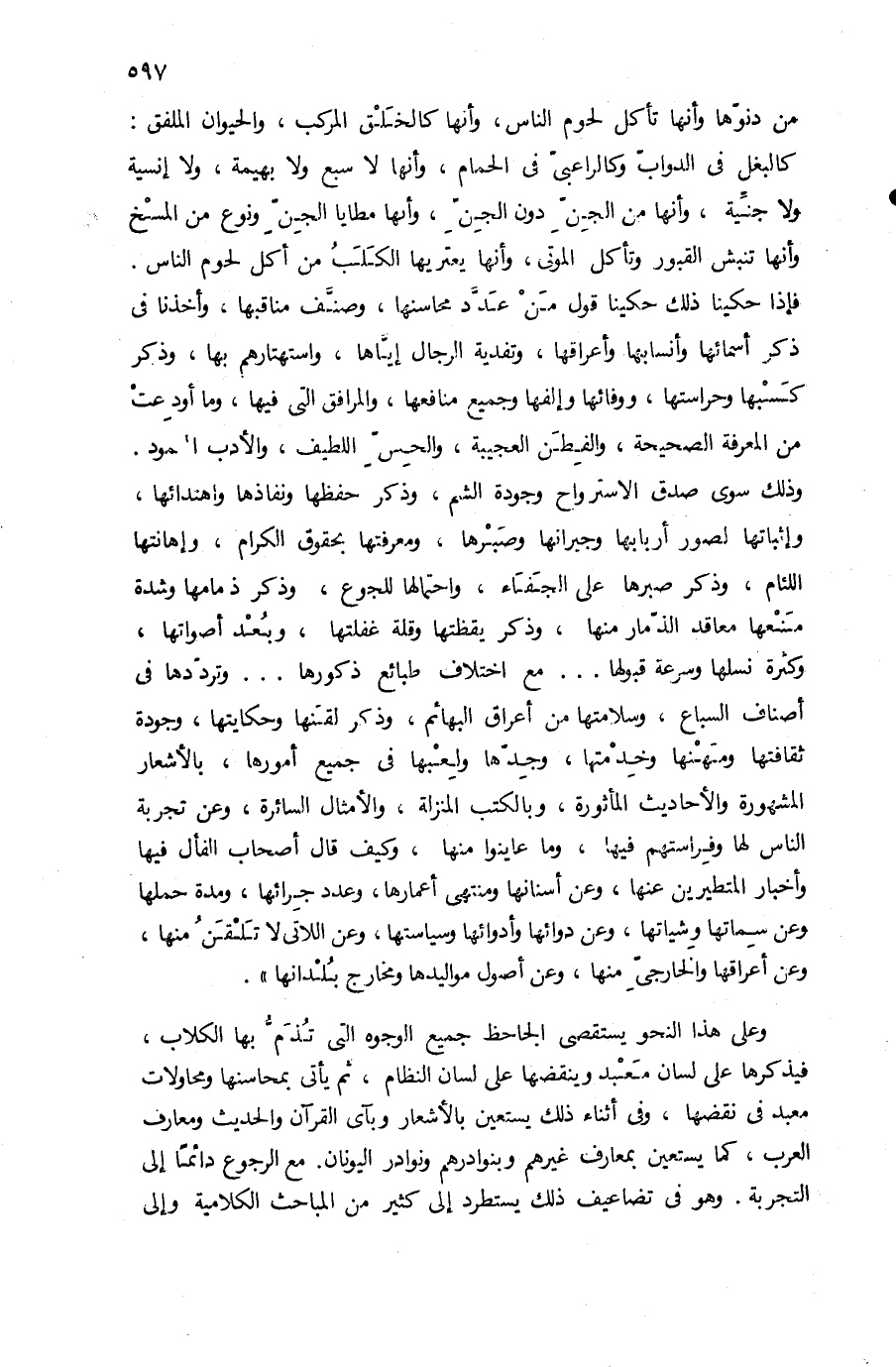 فإذا حكينا ذلك حكينا قول من عدّد محاسنها، وصنّف مناقبها، وأخذنا فى ذكر أسمائها وأنسابها وأعراقها، وتفدية الرجال إيّاها، واستهتارهم بها، وذكر كسبها وحراستها، ووفائها وإلفها وجميع منافعها، والمرافق التى فيها، وما أودعت من المعرفة الصحيحة، والفطن العجيبة، والحسّ اللطيف، والأدب؟ ؟ ؟ .