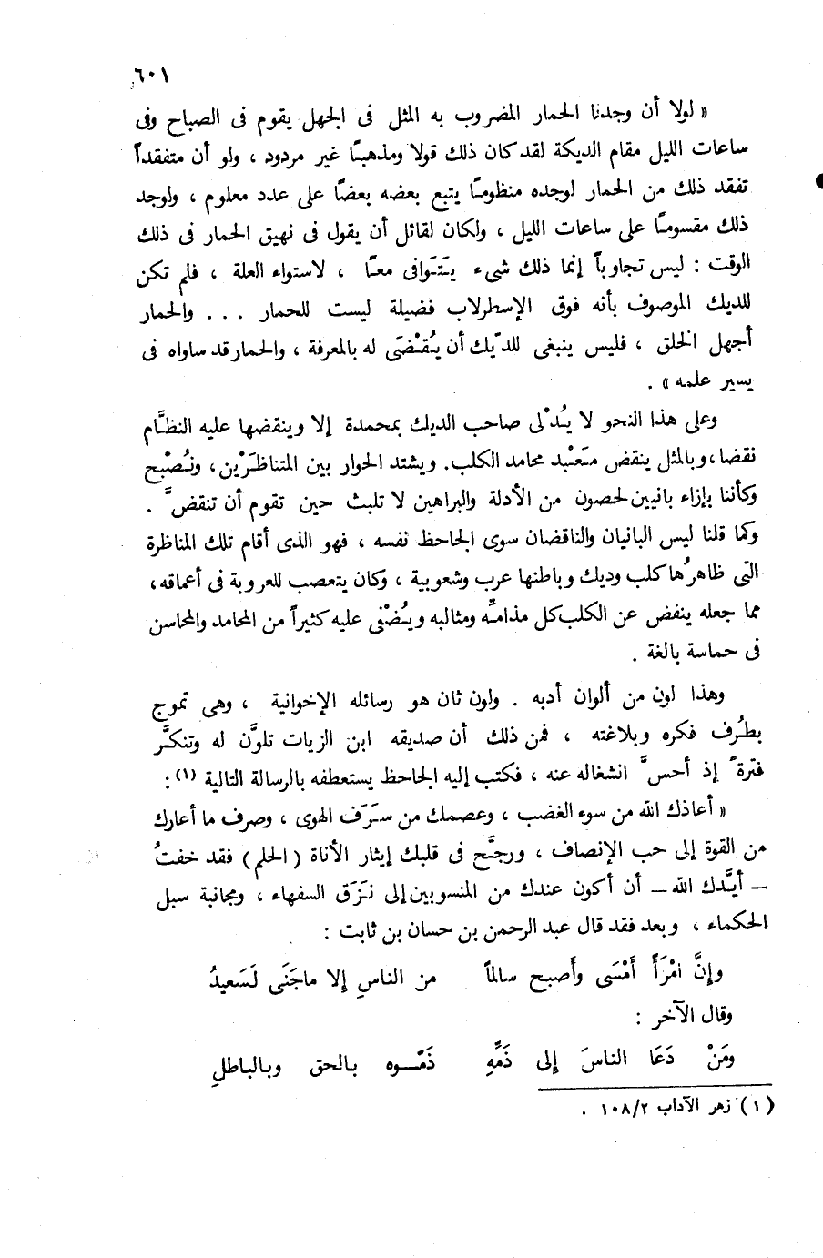 «أعاذك الله من سوء الغضب، وعصمك من سرف الهوى، وصرف ما أعارك من القوة إلى حب الإنصاف، ورجّح فى قلبك إيثار الأناة (الحلم) فقد خفت -أيّدك الله-أن أكون عندك من المنسوبين إلى نزق السفهاء، ومجانبة سبل الحكماء، وبعد فقد قال عبد الرحمن بن حسان بن ثابت: