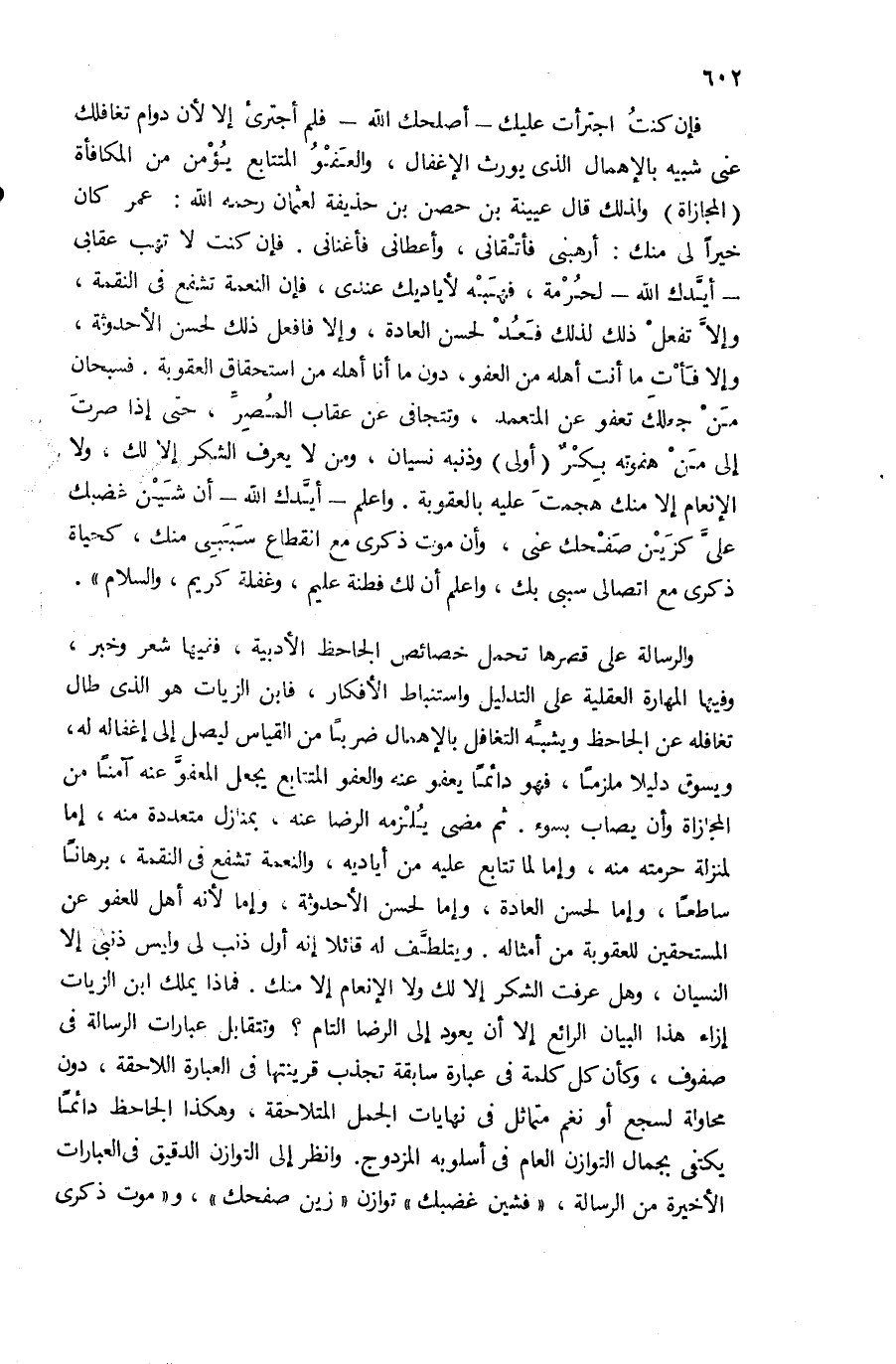 فإن كنت اجترأت عليك-أصلحك الله-فلم أجترئ إلا لأن دوام تغافلك عنى شبيه بالإهمال الذى يورث الإغفال، والعفو المتتابع يؤمن من المكافأة (المجازاة) ولذلك قال عيينة بن حصن بن حذيفة لعثمان رحمه الله: عمر كان خيرا لى منك: أرهبنى فأتقانى، وأعطانى فأغنانى. فإن كنت لا تهب عقابى -أيّدك الله-لحرمة، فهبه لأياديك عندى، فإن النعمة تشفع فى النقمة، وإلاّ تفعل ذلك لذلك فعد لحسن العادة، وإلا فافعل ذلك لحسن الأحدوثة، وإلا فأت ما أنت أهله من العفو، دون ما أنا أهله من استحقاق العقوبة. فسبحان من جعلك تعفو عن المتعمد، وتتجافى عن عقاب المصرّ، حتى إذا صرت إلى من هفوته بكر (أولى) وذنبه نسيان، ومن لا يعرف الشكر إلا لك، ولا الإنعام إلا منك هجمت عليه بالعقوبة. واعلم-أيّدك الله-أن شين غضبك علىّ كزين صفحك عنى، وأن موت ذكرى مع انقطاع سببى منك، كحياة ذكرى مع اتصالى سببى بك، واعلم أن لك فطنة عليم، وغفلة كريم، والسلام».