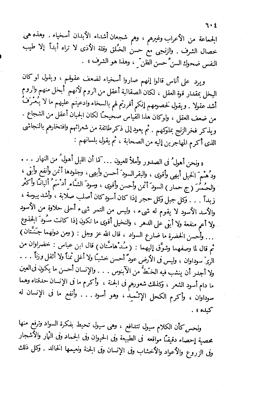 ولا أجدر أن ينشب فيه الخطّ من الآبنوس. . . والإنسان أحسن ما يكون فى العين ما دام أسود الشعر، وكذلك شعورهم فى الجنة، وأكرم ما فى الإنسان حدقتاه وهما سوداوان، وأكرم الكحل الإثمد، وهو أسود. . . وأنفع ما فى الإنسان له كبده».