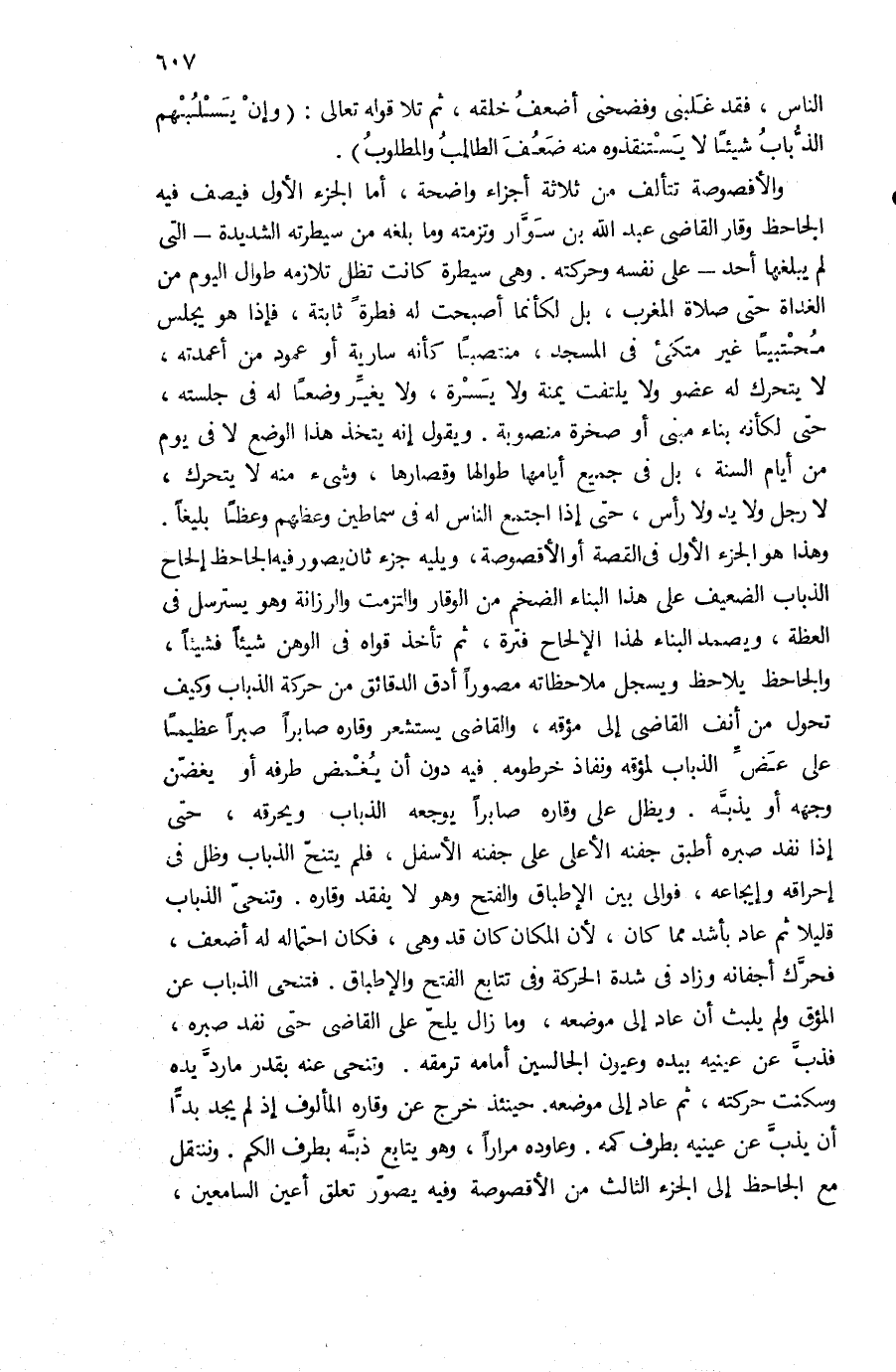 وهذا هو الجزء الأول فى القصة أو الأقصوصة، ويليه جزء ثان يصور فيه الجاحظ إلحاح الذباب الضعيف على هذا البناء الضخم من الوقار والتزمت والرزانة وهو يسترسل فى العظة، ويصمد البناء لهذا الإلحاح فترة، ثم تأخذ قواه فى الوهن شيئا فشيئا، والجاحظ يلاحظ ويسجل ملاحظاته مصورا أدق الدقائق من حركة الذباب وكيف تحول من أنف القاضى إلى مؤقه، والقاضى يستشعر وقاره صابرا صبرا عظيما على عضّ الذباب لمؤقه ونفاذ خرطومه فيه دون أن يغمض طرفه أو يغضّن وجهه أو يذبّه. ويظل على وقاره صابرا يوجعه الذباب ويحرقه، حتى إذا نفد صبره أطبق جفنه الأعلى على جفنه الأسفل، فلم يتنحّ الذباب وظل فى إحراقه وإيجاعه، فوالى بين الإطباق والفتح وهو لا يفقد وقاره. وتنحىّ الذباب قليلا ثم عاد بأشد مما كان، لأن المكان كان قد وهى، فكان احتماله له أضعف، فحرّك أجفانه وزاد فى شدة الحركة وفى تتابع الفتح والإطباق. فتنحى الذباب عن المؤق ولم يلبث أن عاد إلى موضعه، وما زال يلحّ على القاضى حتى نفد صبره، فذبّ عن عينيه بيده وعيون الجالسين أمامه ترمقه. وتنحى عنه بقدر ما ردّ يده وسكنت حركته، ثم عاد إلى موضعه. حينئذ خرج عن وقاره المألوف إذ لم يجد بدّا أن يذبّ عن عينيه بطرف كمه. وعاوده مرارا، وهو يتابع ذبّه بطرف الكم. وننتقل مع الجاحظ إلى الجزء الثالث من الأقصوصة وفيه يصوّر تعلق أعين السامعين،