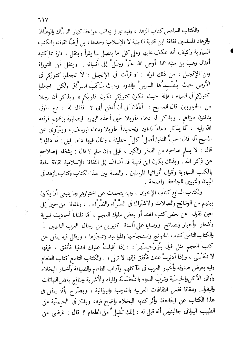 والكتاب الثامن كتاب الحوائج واستنجاحها والمواعيد وتنجّزها، ويظل فيه ينقل عن كتب العجم مثل قول بزرجمهر: «إذا أقبلت عليك الدنيا فأنفق، فإنها لا تفنى، وإذا أدبرت عنك فأنفق فإنها لا تبقى». والكتاب التاسع كتاب الطعام وفيه يعرض صنوفه وأخبار العرب فى مآكلهم وآداب الطعام والضيافة وأخبار البخلاء وأوانى الأكل والحمية وشرب الدواء والتّخمة والمياه والأشربة ومنافع بعض النباتات والبقول. وتلقانا لفس الثقافات العربية والفارسية واليونانية، ويصرّح بأنه ينقل فى هذا الكتاب عن الجاحظ وأثر كتابه البخلاء واضح فيه، ويذكر فى الحمية عن الطبيب اليونانى جالينوس أنه قيل له: إنك تقلّ من الطعام؟ قال: غرضى من