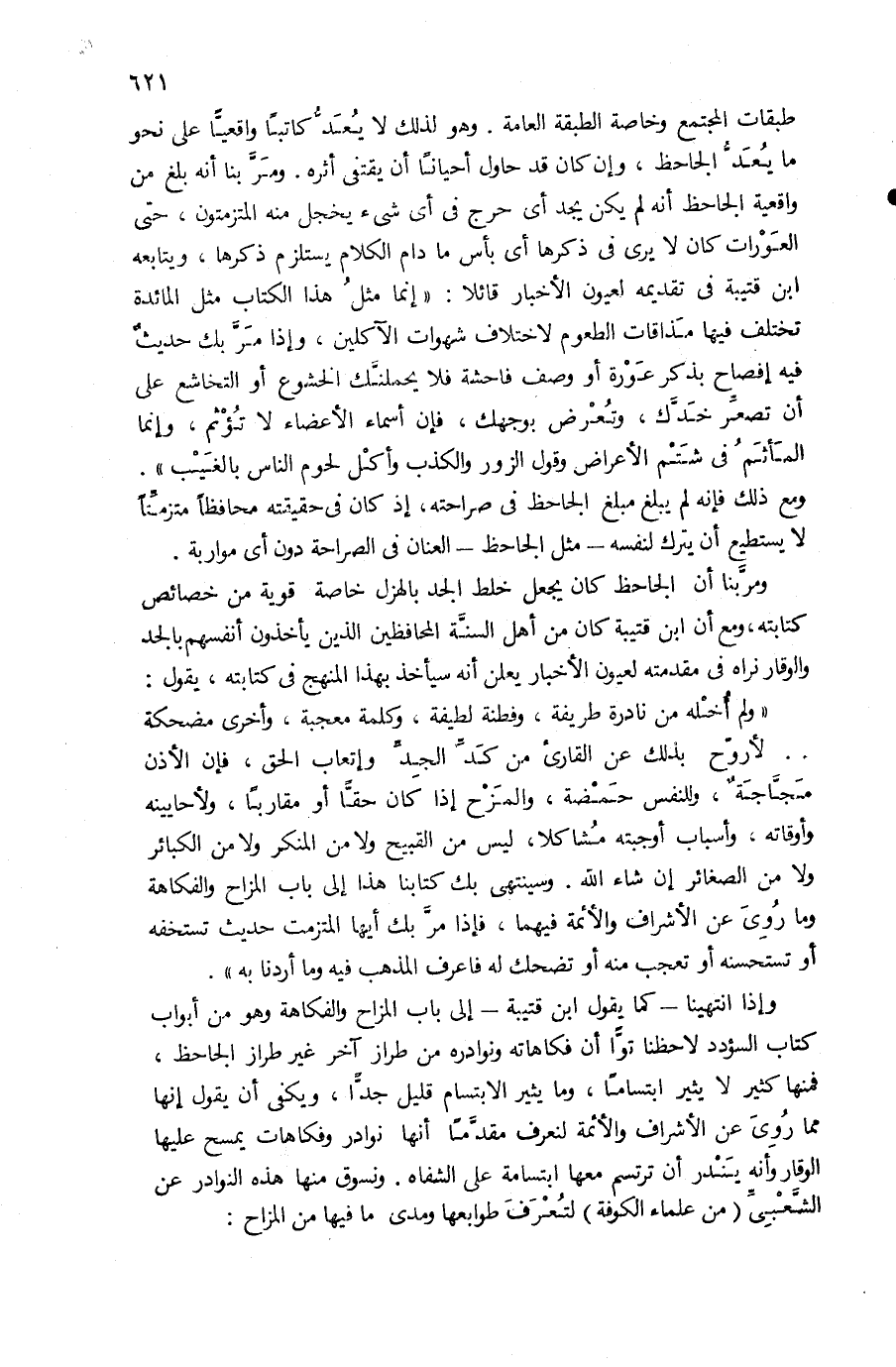 طبقات المجتمع وخاصة الطبقة العامة. وهو لذلك لا يعدّ كاتبا واقعيّا على نحو ما يعدّ الجاحظ، وإن كان قد حاول أحيانا أن يقتفى أثره. ومرّ بنا أنه بلغ من واقعية الجاحظ أنه لم يكن يجد أى حرج فى أى شئ يخجل منه المتزمتون، حتى العورات كان لا يرى فى ذكرها أى بأس ما دام الكلام يستلزم ذكرها، ويتابعه ابن قتيبة فى تقديمه لعيون الأخبار قائلا: «إنما مثل هذا الكتاب مثل المائدة تختلف فيها مذاقات الطعوم لاختلاف شهوات الآكلين، وإذا مرّ بك حديث فيه إفصاح بذكر عورة أو وصف فاحشة فلا يحملنّك الخشوع أو التخاشع على أن تصعّر خدّك، وتعرض بوجهك، فإن أسماء الأعضاء لا تؤثم، وإنما المأثم فى شتم الأعراض وقول الزور والكذب وأكل لحوم الناس بالغيب».
