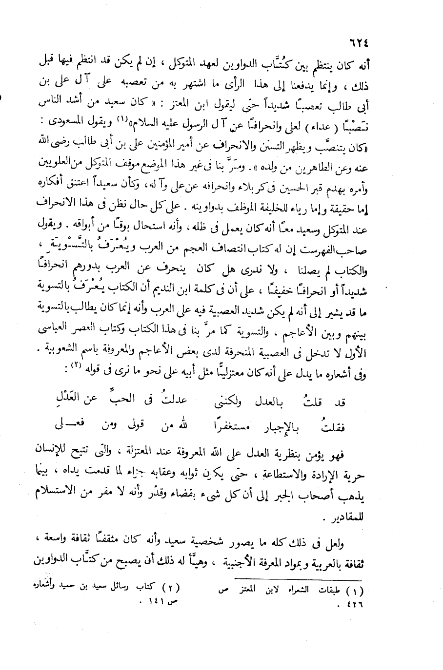 «كان يتنصّب ويظهر التسنن والانحراف عن أمير المؤمنين على بن أبى طالب رضى الله عنه وعن الطاهرين من ولده». ومرّ بنا فى غير هذا الموضع موقف المتوكل من العلويين وأمره بهدم قبر الحسين فى كربلاء وانحرافه عن على وآله، وكأن سعيدا اعتنق أفكاره إما حقيقة وإما رياء للخليفة الموظف بدواوينه. على كل حال نظن فى هذا الانحراف عند المتوكل وسعيد معا أنه كان يعمل فى ظله، وأنه استحال بوقا من أبواقه. ويقول صاحب الفهرست إن له كتاب انتصاف العجم من العرب ويعرف بالتّسوية، والكتاب لم يصلنا، ولا ندرى هل كان ينحرف عن العرب بدورهم انحرافا شديدا أو انحرافا خفيفا، على أن فى كلمة ابن النديم أن الكتاب يعرف بالتسوية ما قد يشير إلى أنه لم يكن شديد العصبية فيه على العرب وأنه إنما كان يطالب بالتسوية بينهم وبين الأعاجم، والتسوية كما مرّ بنا فى هذا الكتاب وكتاب العصر العباسى الأول لا تدخل فى العصبية المنحرفة لدى بعض الأعاجم والمعروفة باسم الشعوبية.