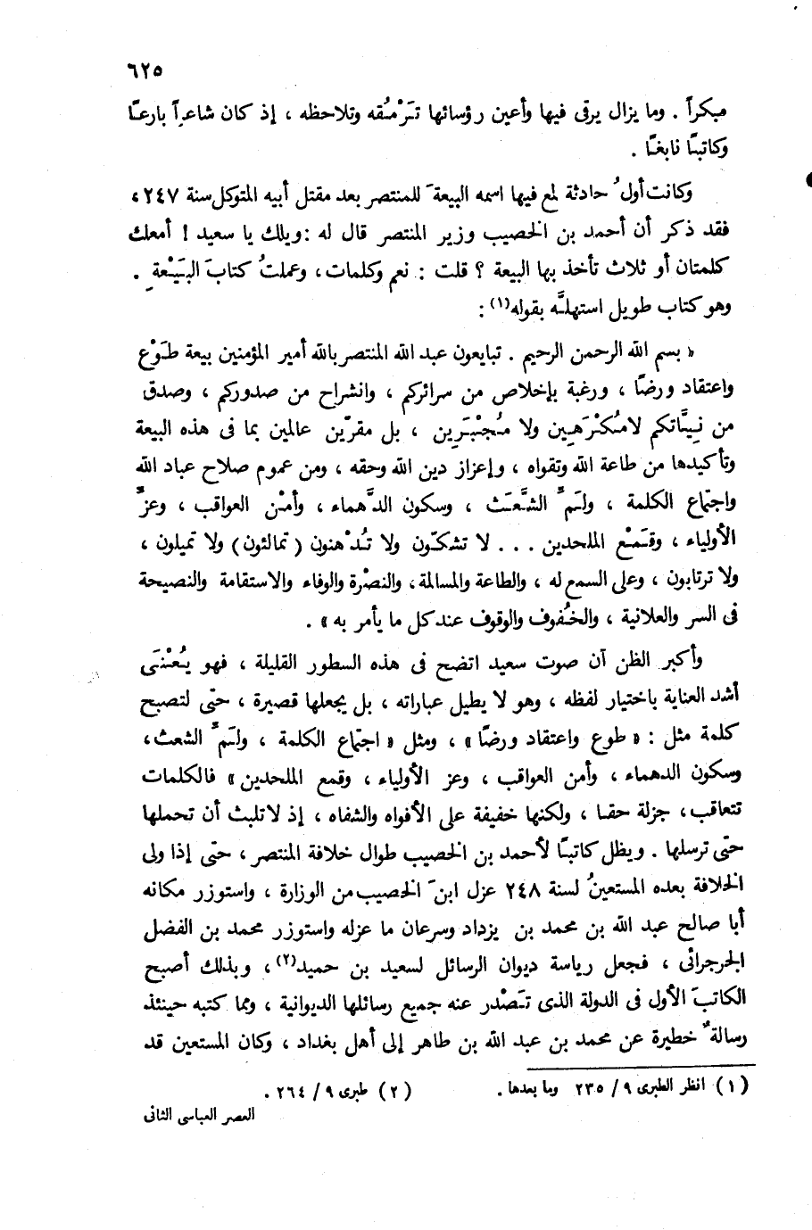 وأكبر الظن ان صوت سعيد اتضح فى هذه السطور القليلة، فهو يعنى أشد العناية باختيار لفظه، وهو لا يطيل عباراته، بل يجعلها قصيرة، حتى لتصبح كلمة مثل: «طوع واعتقاد ورضا»، ومثل «اجتماع الكلمة، ولمّ الشعث، وسكون الدهماء، وأمن العواقب، وعز الأولياء، ولمع الملحدين» فالكلمات تتعاقب، جزلة حقا، ولكنها خفيفة على الأفواه والشفاه، إذ لا تلبث أن تحملها حتى ترسلها. ويظل كاتبا لأحمد بن الخصيب طوال خلافة المنتصر، حتى إذا ولى الخلافة بعده المستعين لسنة 248 عزل ابن الخصيب من الوزارة، واستوزر مكانه أبا صالح عبد الله بن محمد بن يزداد وسرغان ما عزله واستوزر محمد بن الفضل الجرجرائى، فجعل رياسة ديوان الرسائل لسعيد بن حميد (¬2)، وبذلك أصبح الكاتب الأول فى الدولة الذى تصدر عنه جميع رسائلها الديوانية، ومما كتبه حينئذ رسالة خطيرة عن محمد بن عبد الله بن طاهر إلى أهل بغداد، وكان المستعين قد