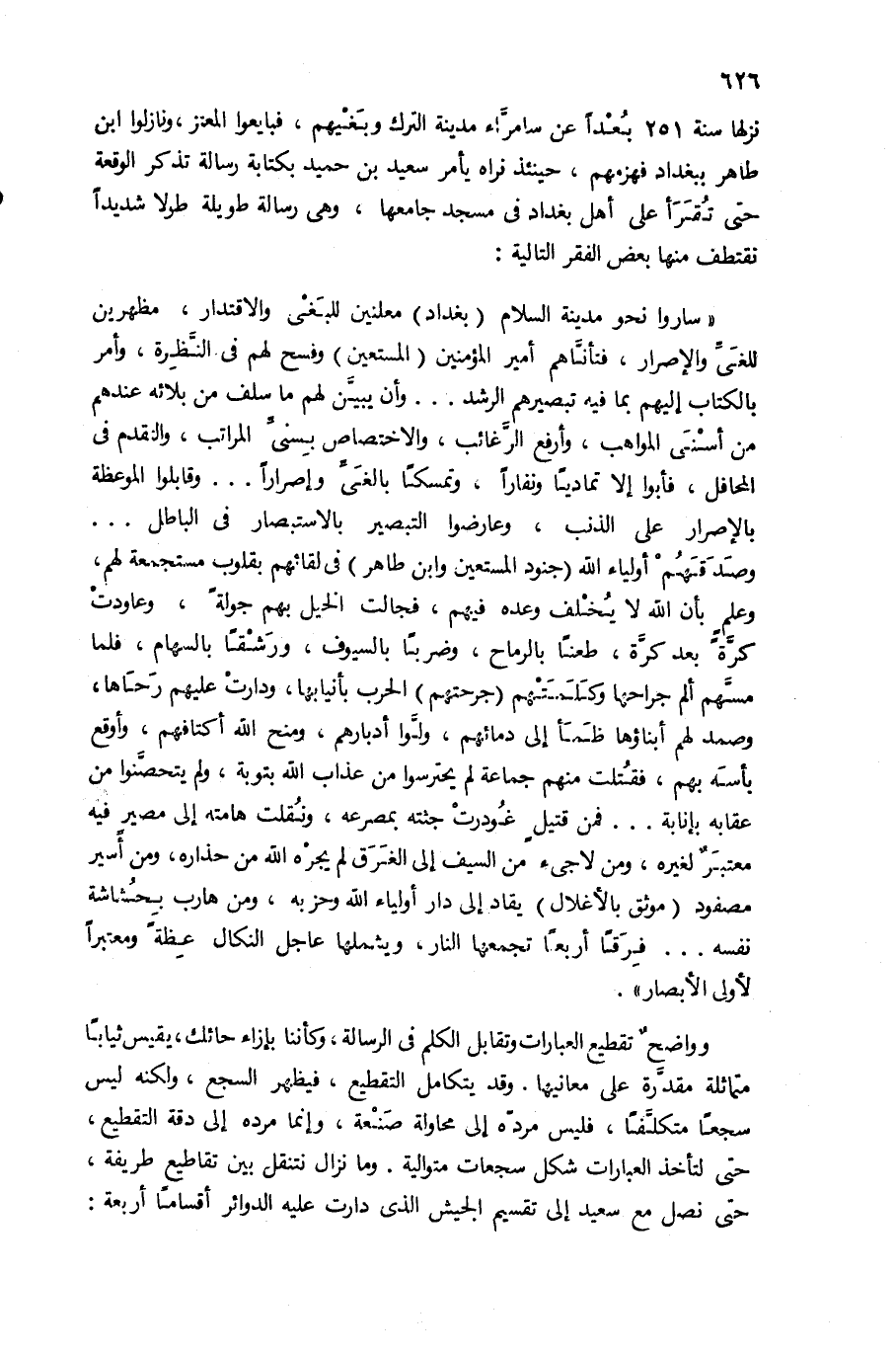 «ساروا نحو مدينة السلام (بغداد) معلنين للبغى والاقتدار، مظهرين للغىّ والإصرار، فتأنّاهم أمير المؤمنين (المستعين) وفسح لهم فى النّظرة، وأمر بالكتاب إليهم بما فيه تبصيرهم الرشد. . . وأن يبيّن لهم ما سلف من بلائه عندهم من أسنى المواهب، وأرفع الرّغائب، والاختصاص بسنىّ المراتب، والتقدم فى المحافل، فأبوا إلا تماديا ونفارا، وتمسكا بالغىّ وإصرارا. . . وقابلوا الموعظة بالإصرار على الذنب، وعارضوا التبصير بالاستبصار فى الباطل. . .