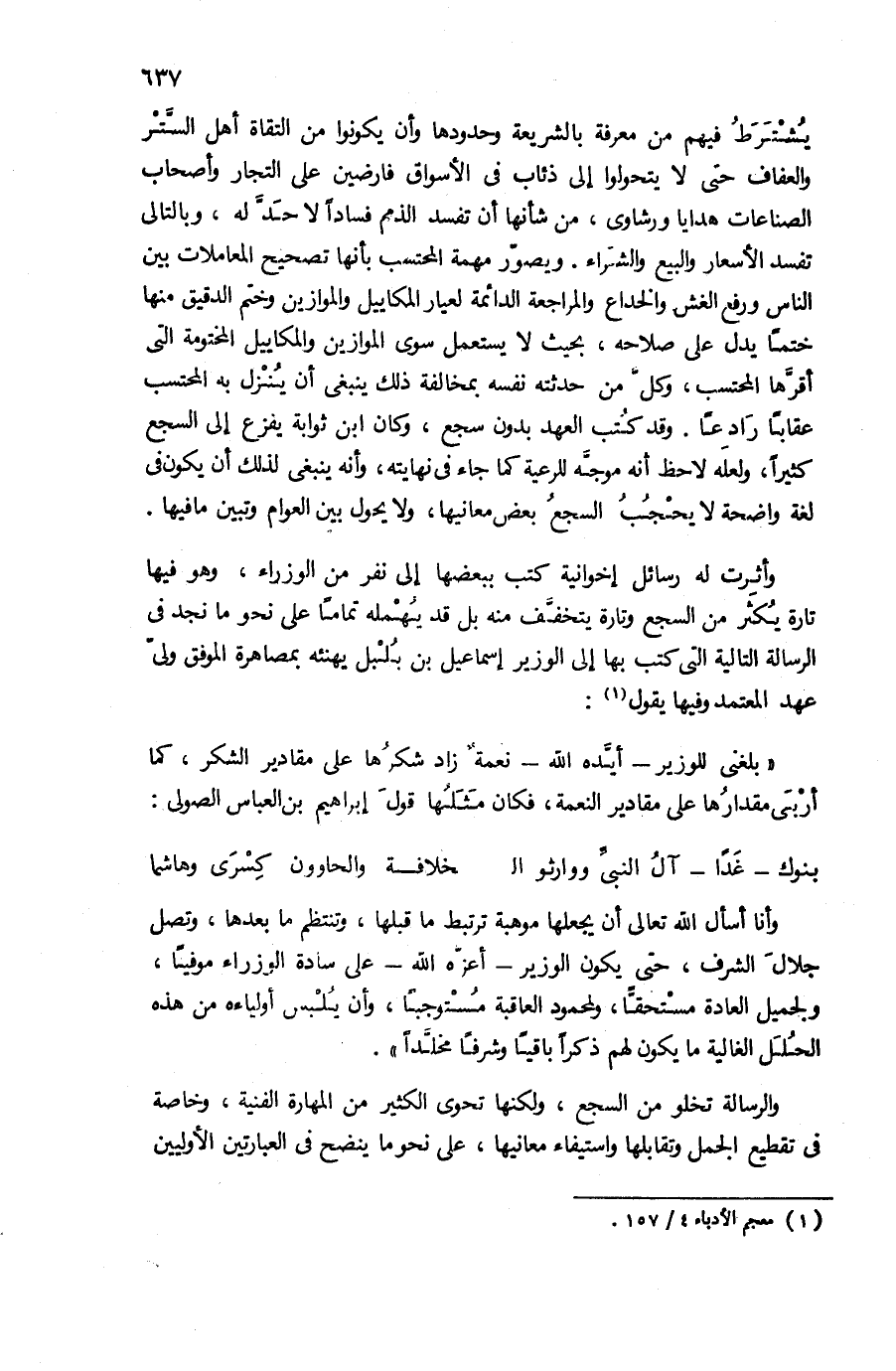 «بلغنى للوزير-أيّده الله-نعمة زاد شكرها على مقادير الشكر، كما أربى مقدارها على مقادير النعمة، فكان مثلها قول إبراهيم بن العباس الصولى:
