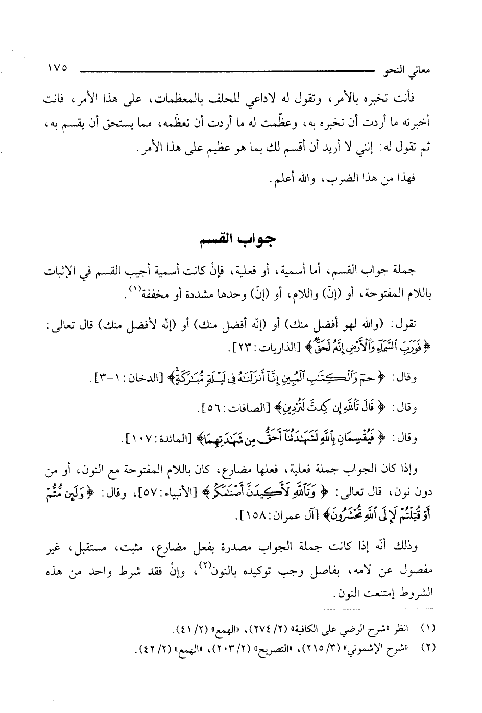 وذلك إنه إذا كانت جملة الجواب مصدرة بفعل مضارع، مثبت، مستقبل، غير مفصول عن لامه، بفاصل وجب توكيد بالنون (¬2). وإن فقد شرط واحد من هذه الشروط إمتنعت النون.