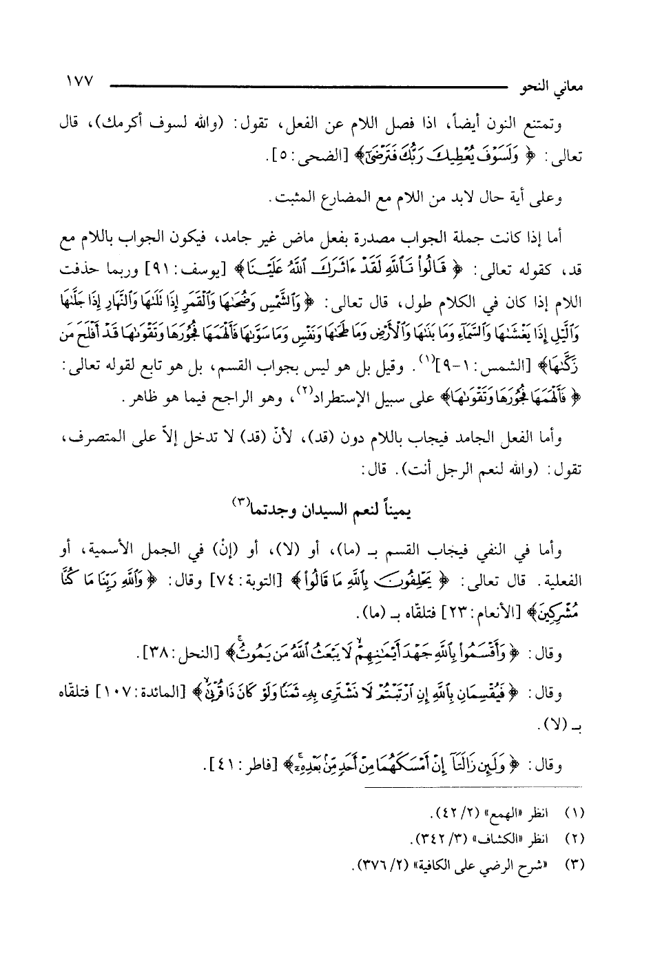 أما إذا كانت جملة الجواب مصدرة بفعل ماض غير جامد، فيكون الجواب باللام مع قد، كقوله تعالى: {قالوا تالله لقد آثرك الله علينا} [يوسف: 91]، وربما حذفت اللام، إذا كان في الكلام طول، قال تعالى: {والشمس وضحاها والقمر إذا تلاها والنهار إذا جلاها والليل إذا يغشاها والسماء وما بناها والأرض وما طحاها ونفس وما سواها فألهمها فجورها وتقوها قد أفلح من زكاها} [الشمس: 1 - 9] (¬1).