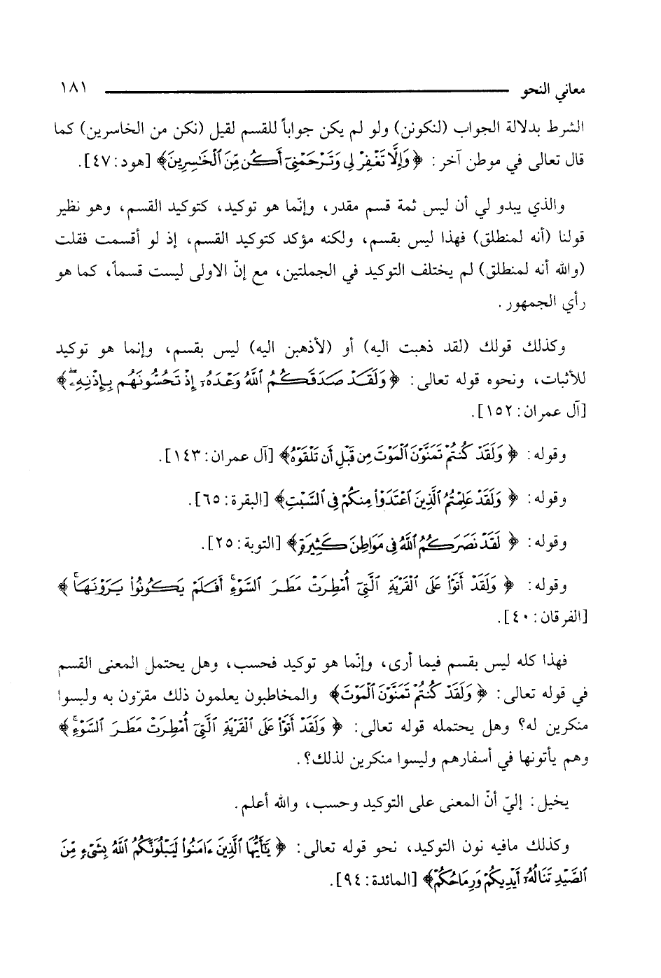 وقوله: {ولقد أتوا على القرية التي أمطرت مطر السوء أفلم يكونوا يرونها} [الفرقان: 40]. فهذا كله ليس بقسم فيما أرى، وإنما هو توكيد فحسب، وهل يحتمل المعنى القسم في قوله تعالى: {ولقد كنتم تمنون الموت} والمخاطبون يعلمون ذلك مقرون به وليسوا منكرين له؟ وهل يحتمله قوله تعالى: {ولقد أتوا على القرية التي أمطرت مطر السوء} وهم يأتونها في أسفارهم وليسوا منكرين لذلك؟