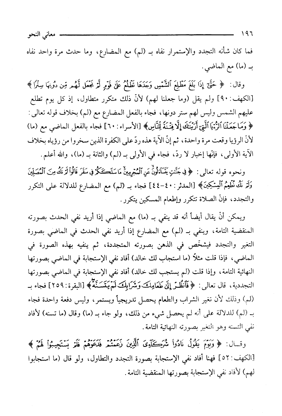 ويمكن أن يقال أيضا أنه قد ينفي بـ (ما) مع الماضي إذا أريد نفي الحدث بصورته المنقضية التامة، وينفي بـ (لم) مع المضارع إذا أريد نفي الحدث في الماضي بصورة التغير والتجدد فيشخص في الذهن بصورته المتجددة، ثم ينفيه بهذه الصورة في الماضي، فإذا قلت مثلا (ما استجاب لك خالد) أفاد نفي الاستجابة في الماضي بصورتها النهائية التامة، وإذا قلت (لم يستجب لك خالد) أفاد نفي الاستجابة في الماضي بصورتها التجددية، قال تعالى: {فانظر إلى طعامك وشرابك لم يتسنه} [البقرة: 259]، فجاء بـ (لم) وذلك لأن تغير الشراب والطعام يحصل تدريجيا ويستمر وليس دفعة واحدة فجاء بـ (لم) للدلالة على أنه لم يحصل شيء من ذلك، ولو جاء بـ (ما) وقال (ما تسنه) لأفاد نفي التسنه وهو التغير بصورته النهائية التامة.