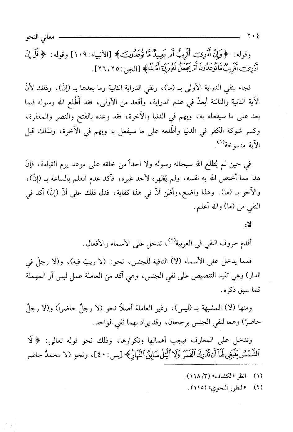 ومنها (لا) المشبهة بـ (ليس)، وغير العاملة أصلا نحو (لا رجل حاضرا) و (لا رجل حاضرٌ) وهما لنفي الجنس برجحان، وقد يراد بهما نفي الواحد.