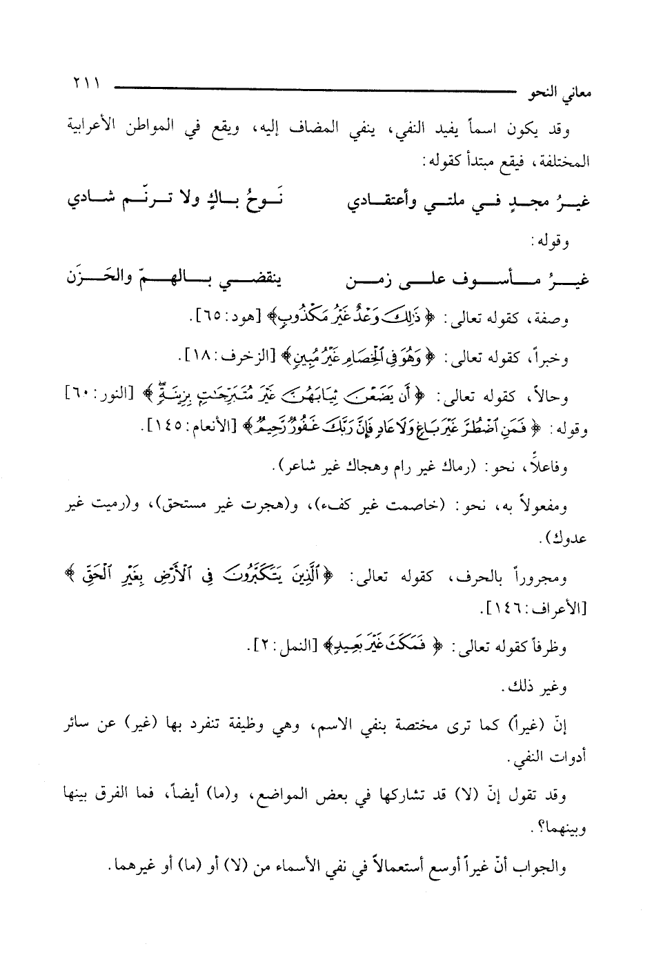 ومفعولا: نحو: (خاصمت غير كفء)، و (هجرت غير مستحق)، و (رميت غير عدوك). ومجرورًا بالحرف، كقوله تعالى: {الذين يتكبرون في الأرض بغير الحق} [الأعراف: 146].