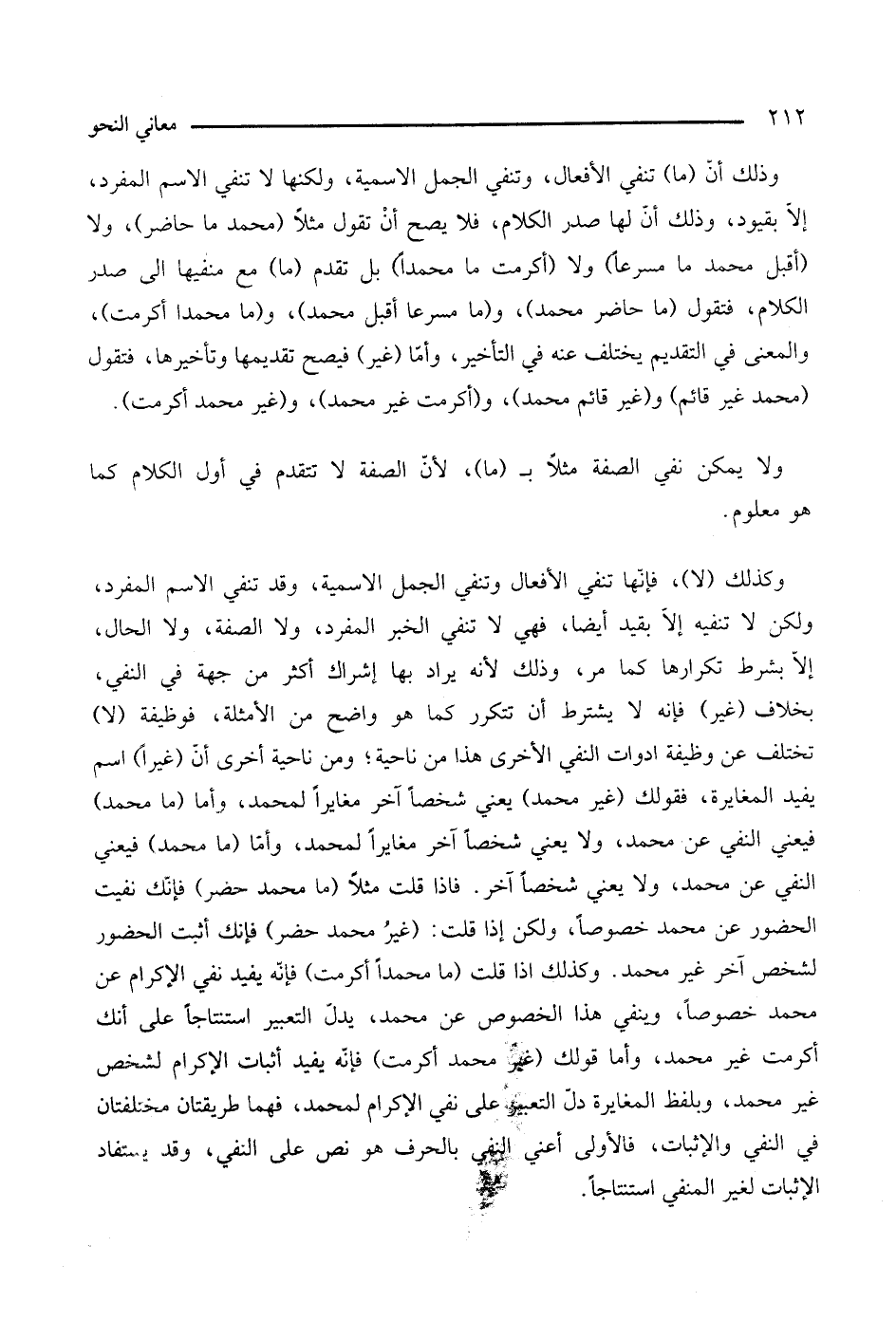 ولا يمكن نفي الصفة مثلا بـ (ما) لأن الصفة لا تتقدم في أول الكلام كما هو معلوم. وكذلك (لا) فإنها تنفي الأفعال وتنفي الجمل الإسمية، وقد تنفي الاسم المفرد، ولكن لا تنفيه إلا بقيد أيضا، فهي لا تنفي الخبر المفرد، ولا الصفة، ولا الحال، إلا بشرط تكرارها كما مر، وذلك لأنه يراد بها إشراك أكثر من جهة في النفي، بخلاف (غير) فإنه لا يشترط أن تتكرر كما هو واضح من الأمثلة، فوظيفة (لا) تختلف عن وظيفة أدوات النفي الأخرى هذا من ناحية، ومن ناحية أخرى أن (غيرا) اسم يفيد المغايرة، فقولك (غير محمد) يعني شخصا آخر مغايرا لمحمد، وأما (ما محمد) فيعني النفي عن محمد، ولا يعني شخصا آخر مغايرا لمحمد، وأما (ما محمد) فيعني النفي عن محمد، ولا يعني شخصا آخر، فإذا قلت مثلا (ما محمد حضر) فإنك نفيت الحضور عن محمد خصوصا، ولكن إذا قلت: (غير محمد حضر) فإنك أثبت الحضور لشخص آخر غير محمد. وكذلك إذا قلت (ما محمدًا أكرمت) فإنه يفيد نفي الإكرام عن محمد خصوصا، وينفي هذا الخصوص عن محمد، يدل التعبير استنتاجًا عن أنك أكرمت غير محمد، وأما قولك (غير محمد أكرمت)، فإنه يفيد إثبات الإكرام لشخص غير محمد، وبلفظ المغايرة دل التعبير على نفي الإكرام لمحمد، فهما طريقتان مختلفتان في النفي والإثبات، فالأولى أعني بالحرف هو نص على النفي، وقد يستفاد الإثبات لغير المنفي استنتاجًا.
