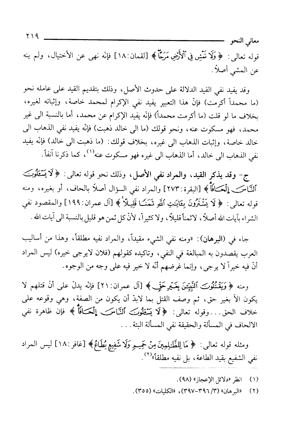 ج - وقد يذكر القيد، والمراد نفي الأصل، وذلك نحو قوله تعالى: {لا يستئلون الناس إلحافا} [البقرة: 273]، والمراد نفي السؤال أصلا بالحاف، أو بغيره، ومنه قوله تعالى: {لا يشترون بآيات الله ثمنا قليلا} [آل عمران: 199]، والمقصود نفي الشراء بآيات الله أصلا، لا ثمنا قليلا، ولا كثيرا، لأن كل ثمن هو قليل بالنسبة إلى آيات الله.