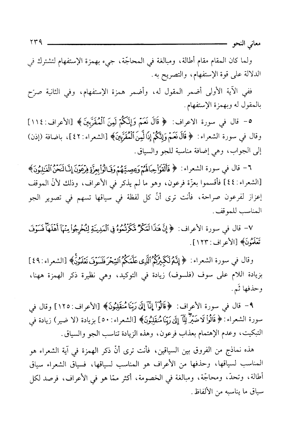 هذه نماذج من الفروق بين السياقين، فأنت ترى أن ذكر الهمزة في آية الشعراء هو المناسب لسياقها، وحذفها من الأعراف هو المناسب لسياقها، فسياق الشعراء سياق إطالة، وتحد ومحاجة، ومبالغة في الخصومة، أكثر مما هو في الأعراف، فرصد لكل سياق ما يناسبه من الألفاظ.