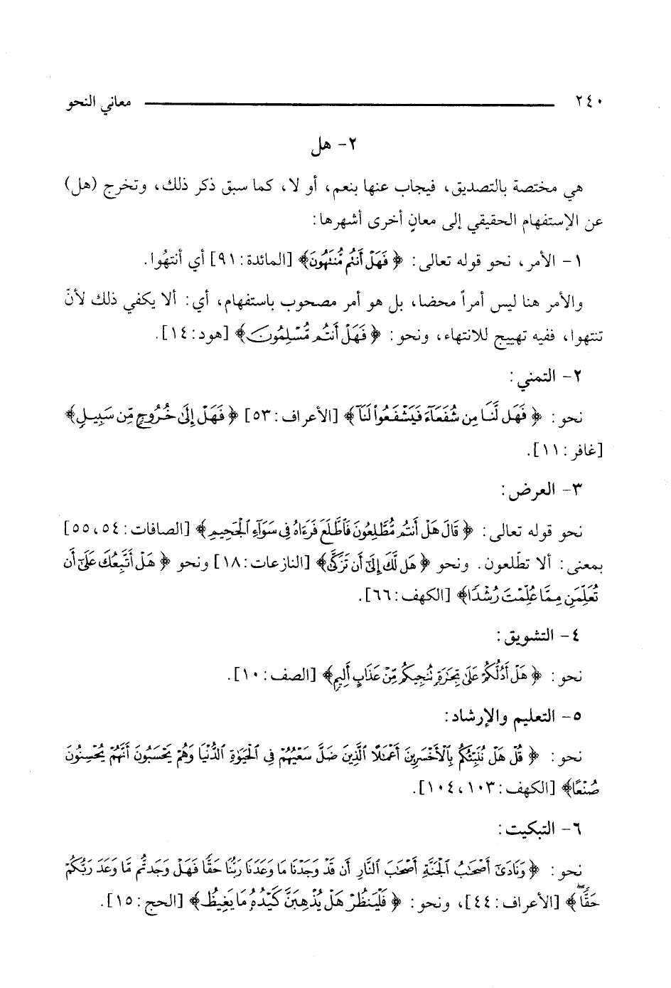 نحو قوله تعالى: {قال هل أنتم مطلعون فاطلع فرءاه في سواء الجحيم} [الصافات: 54 - 55]، بمعنى: ألا تطلعون. ونحو {هل لك إلى أن تزكى} [النازعات: 18]، ونحو: {هل أتبعك على أن تعلمن ما علمت رشدًا} [الكهف: 66].