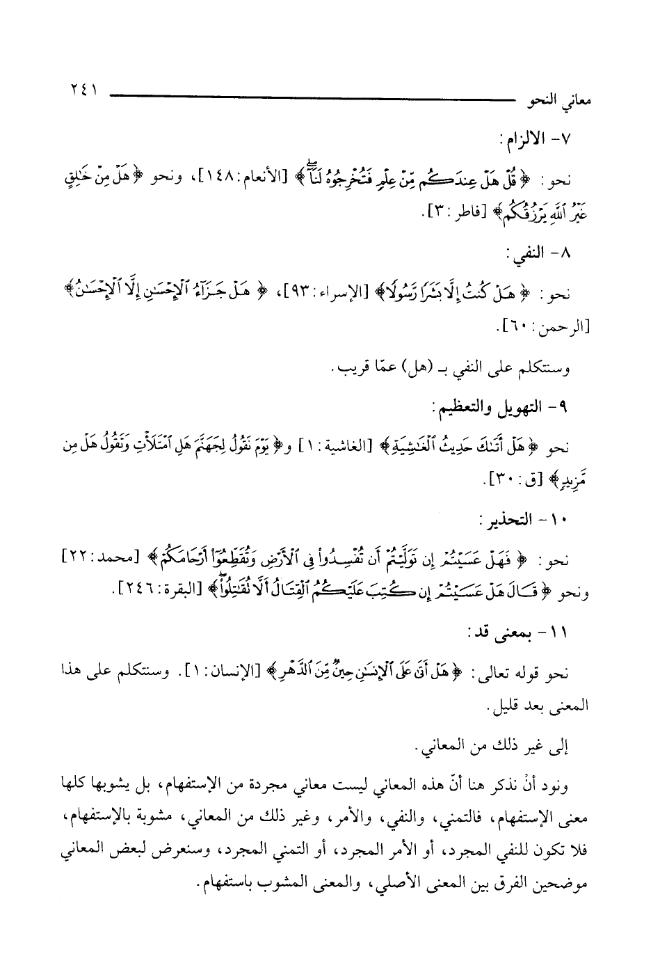 8 - النفي: نحو: {هل كنت إلا بشرا رسولا} [الإسراء: 93]، و {هل جزاء الإحسان إلا الإحسان} [الرحمن: 60]. وسنتكلم عن النفي بـ (هل) عما قريب.
