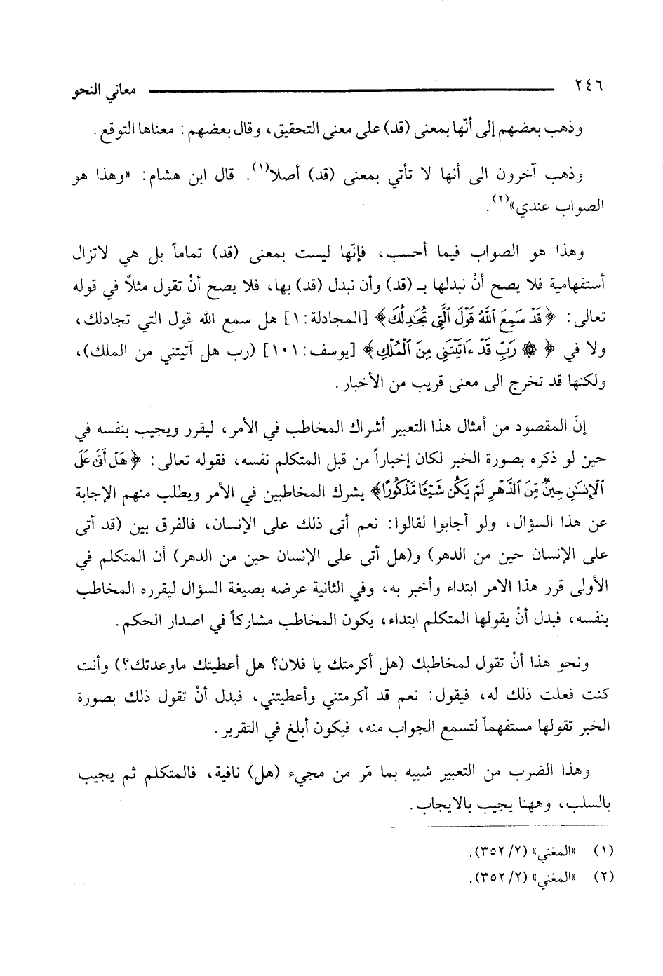وهذا هو الصواب فيما أحسب، فغنها ليست بمعنى (قد) تمامًا بل هي لا تزال استفهامية فلا يصح أن نبدلها بـ (قد) وأن نبدل (قد) بها، فلا يصح أن تقول مثلا في قوله تعالى: {قد سمع الله قول التي تجادلك} [المجادلة: 1]، هل سمع الله قول التي تجادلك، ولا في {رب قد آتيتني من الملك} [يوسف: 101]، (رب هل آتيتني من الملك)، ولكنها قد تخرج إلى معنى قريب من الأخبار.