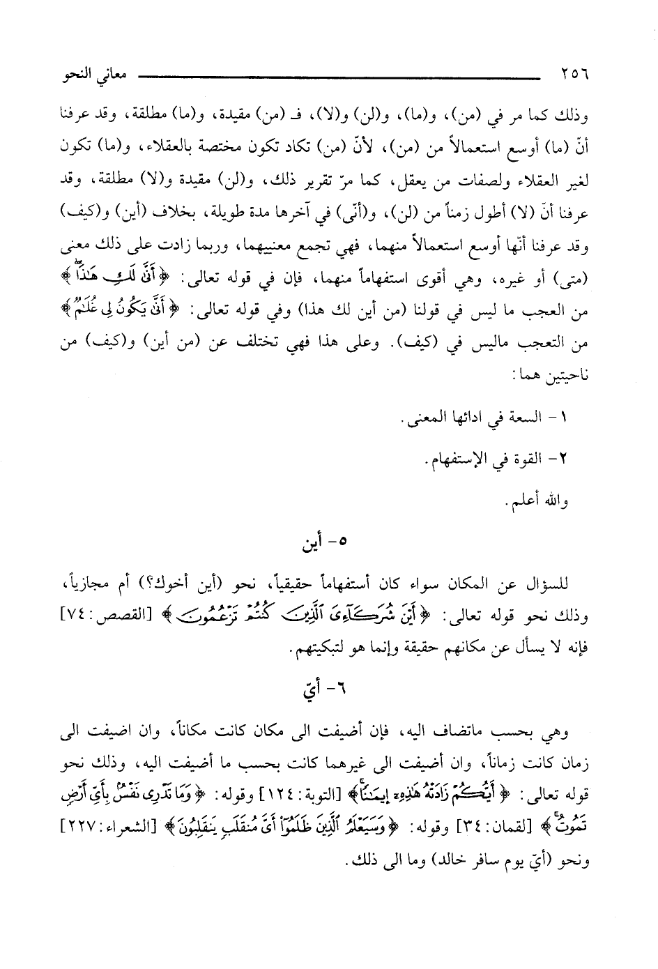 وذلك كما مر في (من)، و (ما)، و (لن)، و (لا) فـ (من) مقيدة، و (ما) مطلقة، وقد عرفنا أن (ما) أوسع استعمالا من (من) لأن (من) تكاد تكون مختصة بالعقلاء، و (ما) تكون لغير العقلاء ولصفات من يعقل، كما مر تقرير ذلك، و (لن) مقيدة و (لا) مطلقة، وقد عرفنا أن (لا) أطول زمنا من (لن) و (أنى) في آخرها مدة طويلة، بخلاف (أين) و (كيف) وقد عرفنا أنها أوسع استعمالا منهما، فهي تجمع معنييهما، وربما زادت على ذلك معنى (متى) أو غيره، وهي أقوى استفهاما منهما، فإن في قوله تعالى: {أنى لك هذا} من العجب ما ليس في قولنا (من أين لك هذا) وفي قوله تعالى: {أنى يكون لي غلام} من التعجب ما ليس في (كيف). وعلى هذا فهمي تختلف عن (من أين) و (كيف) من ناحيتين هما:
