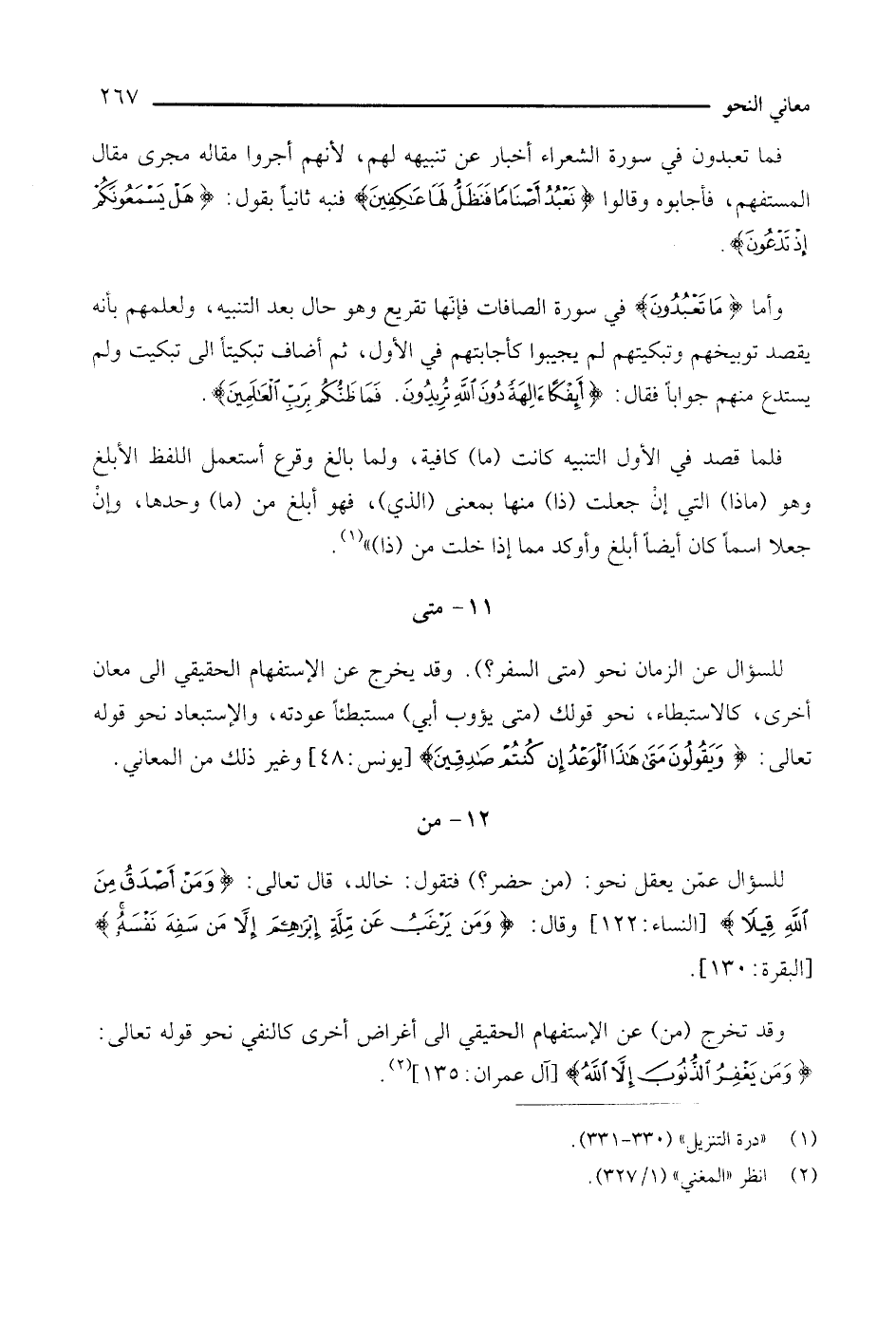 للسؤال عمن يعقل نحو: (متى حضر؟ ) فتقول: خالد، قال تعالى: {ومن أصدق من الله قيلا} [النساء: 122]، وقال: {ومن يرغب عن ملة إبراهيم إلا من سفه نفسه} [البقرة: 130].