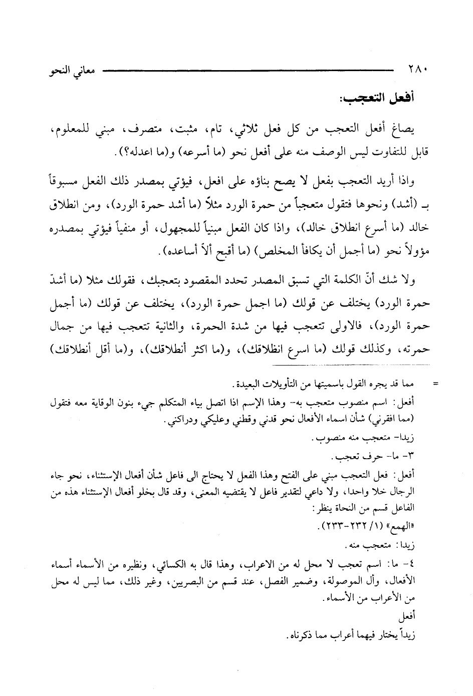 = مما قد يجره القول باسميتها من التأويلات البعيدة، أفعل: اسم منصوب متعجب به - وهذا الاسم إذا اتصل بياء المتكلم جيء بنون الوقاية معه فتقول مما افقرني شأن اسماء الافعال نحو قدني وقطني وعليكي ودراكني. زيدا - متعجب منه منصوب. 3 - ما - حرف تعجب. أفعل: فعل التعجب مبني على الفتح وهذا الفعل لا يحتاج إلى فاعل شأن أفعال الاستثناء، نحو جاء الرجال خلا واحدا، ولا داعي لتقدير فاعل لا يقتضيه المعنى، وقد قال بخلو أفعال الاستثناء هذه من الفاعل قسم من النحاة ينظر الهمع: 1/ 232 - 233، زيد: متعجب منه 4 - ما: اسم تعجب لا محل له من الاعراب، وهذا قال به الكسائي، ونظره من الأسماء أسماء الأفعال، وأل الموصلة وضمير الفصل عند قسم من البصريين وغير ذلك مما ليس له محل من الاعراب من الاسماء، افعل زيدا يختار فيهما اعراب مما ذكرناه.