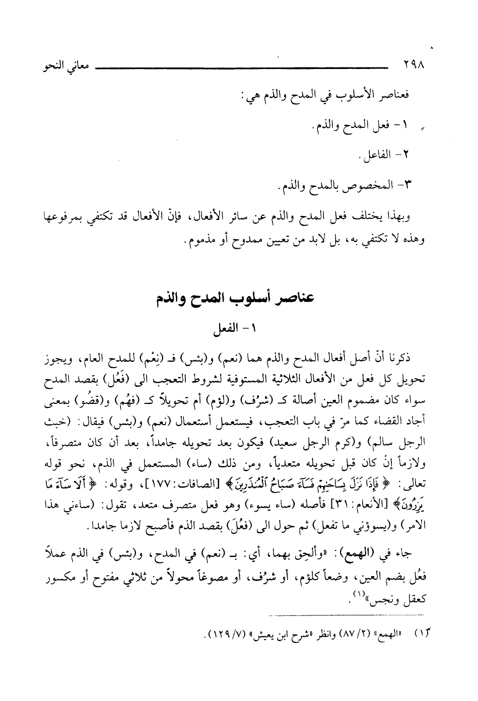 ذكرنا أن الأصل أفعال المدح والذم هما (نعم) و (بئس) فـ (نعم) للمدح العام، ويجوز تحويل كل فعل من الأفعال الثلاثية مستوفية لشروط التعجب إلى (فعل) بقصد المدح سواء كان مضموم العين أصالة كـ (شرف) و (لؤم) أم تحويلا كـ (فهم) و (قضو) بمعنى أجاد القضاء كما مر في باب التعجب، فيستعمل أستعمال (نعم) و (بئس) فيقال: (خبث الرجل سالم) و (كرم الرجل سعيد) فيكون بعد تحويله جامدًا، بعد أن كان متصرفا ولازما إن كان قبل تحويله متعديا، ومن ذلك ساء المستعمل في الذم، نحو قوله تعالى: {فإذا نزل بساحتهم فساء صباح المنذرين} [الصافات: 177]، وقوله: {ألا ساء ما يزرون} [الأنعام: 31]، فأصله (ساء يسوء) وهو فعل متصرف متعد، تقول: (ساءني هذا الأمر) و (يسوؤني ما تفعل) ثم حول إلى (فعُلَ) بقصد الذم فأصبح لازمًا جامدًا.