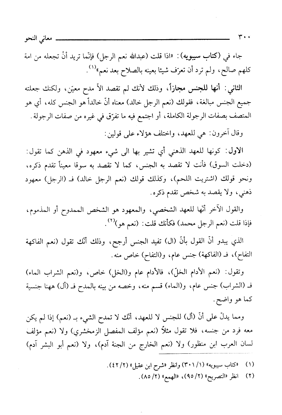 ومما يدل على أن (أل) للجنس لا للعهد، أنك لا تمدح الشيء بـ (نعم) إذا لم يكن معه فرد من جنسه، فلا تقول مثلا (نعم مؤلف المفصل الزمخشري) ولا (نعم مؤلف لسان العرب ابن منظور) ولا (نعم الخارج من الجنة آدم)، ولا (نعم أبو البشر آدم).