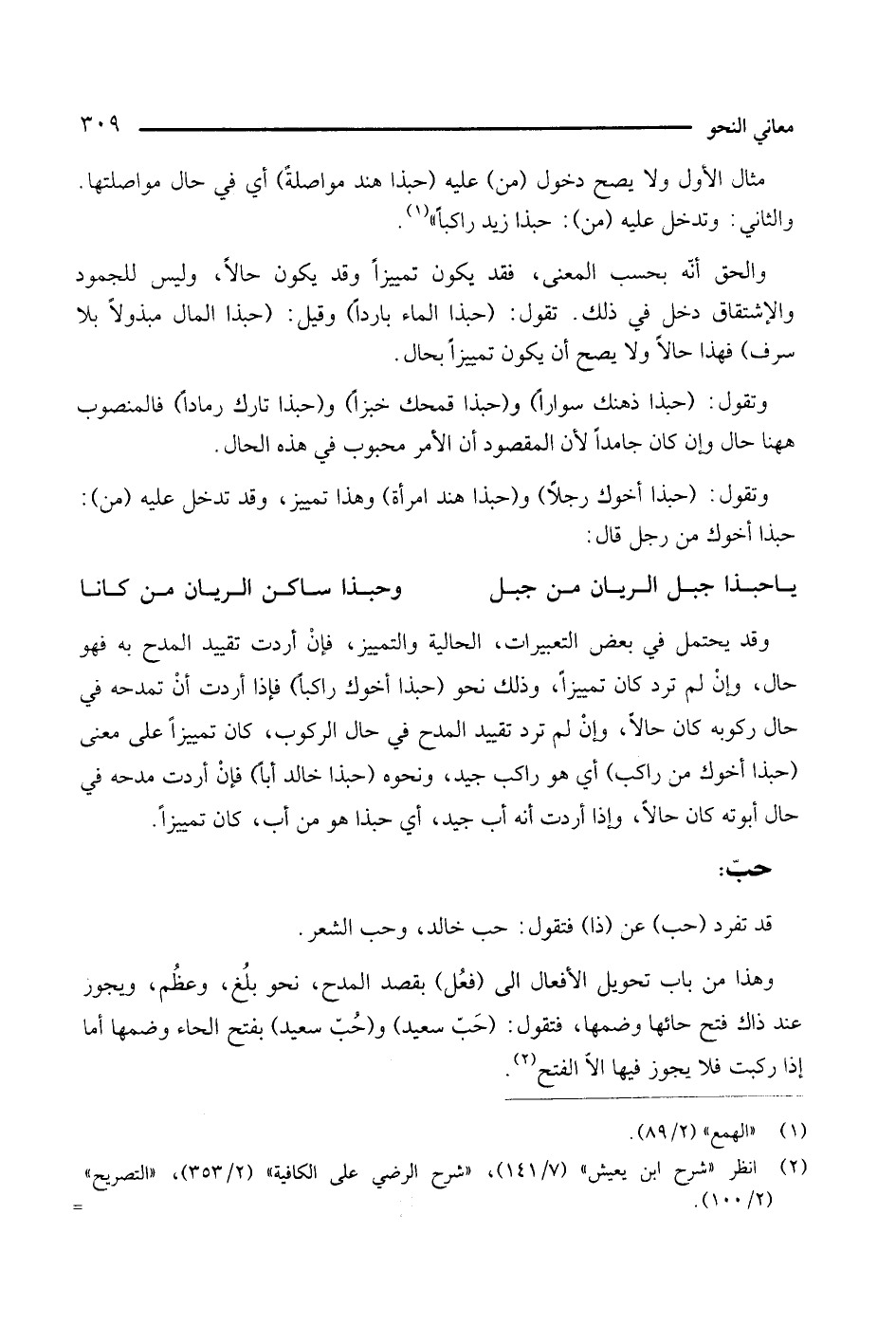 وهذا من باب تحويل الأفعال إلى (فعُل) بقصد المدح، نحو بلغ، وعظم ويجوز عند ذاك فتح حائها وضمها، فتقول: (حب سعيد) و (حُب سعيد) بفتح الحاء وضمها أما إذا ركبت فلا يجوز فيها إلا الفتح (¬2).