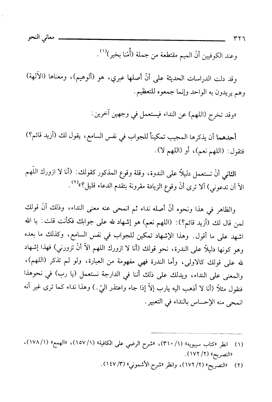 والظاهر في هذا ونحوه أن أصله نداء ثم انمحى عنه معنى النداء، وذلك أن قولك لمن قال لك (أزيد قائم)؟ (اللهم نعم) هو إشهاد لله على جوابك فكأنك قلت: يا الله أشهد على ما أقول: وهذا الإشهاد تمكين للجواب في نفس السامع، وكذلك ما بعده وهو كونها دليلا على الندرة، نحو قولك (أنا لا أزورك، اللهم إلا ان تزورني) فهذا إشهاد لك على قولك كالأولى، وأما الندرة فهي مفهومة من العبارة، ولو لم تذكر (اللهم)، والمعنى على النداء، ويدلك على ذلك أننا في الدارجة نستعمل (يارب) في نحو هذا فتقول مثلا (أنا لا أذهب إليه يارب إلا إذا جاء واعتذر إلي) وهذا نداء كما ترى غير أنه انمحى منه الاحساس بالنداء في التعبير.