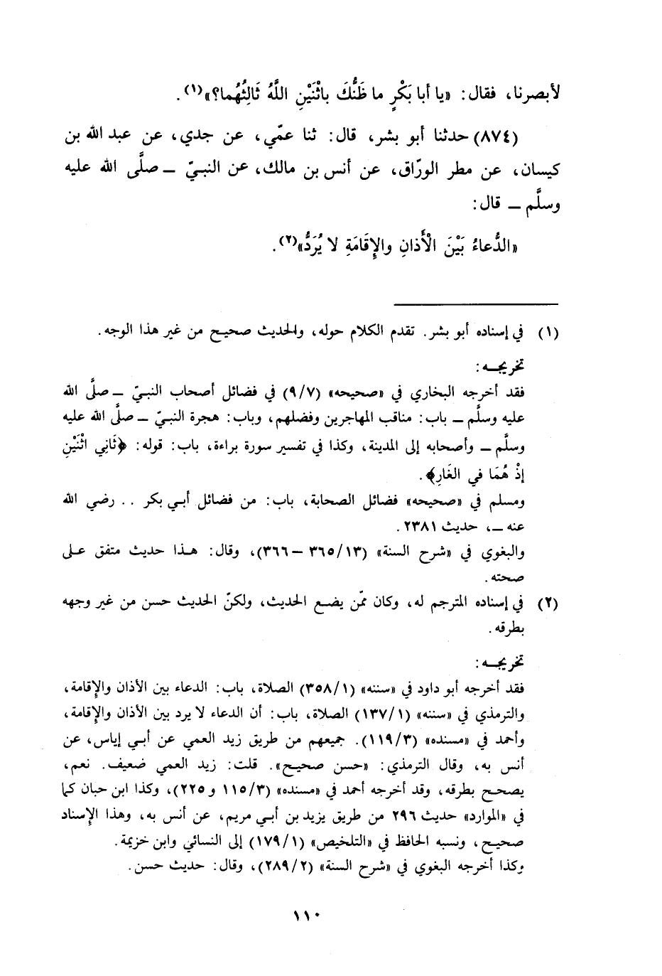 حَدَّثَنَا أَبُو بِشْرٍ , قال: ثنا عَمِّي , عَنْ جَدِّي , عَنْ عَبْدِ اللَّهِ بْنِ كَيْسَانَ , عَنْ مَطَرٍ الْوَرَّاقِ , عَنْ أَنَسِ بْنِ مَالِكٍ , أَنّ النَّبِيَّ صَلَّى اللهُ عَلَيْهِ وَسَلَّمَ، قَالَ: «§الدُّعَاءُ بَيْنَ الأَذَانِ وَالإِقَامَةِ لا يُرَدُّ»