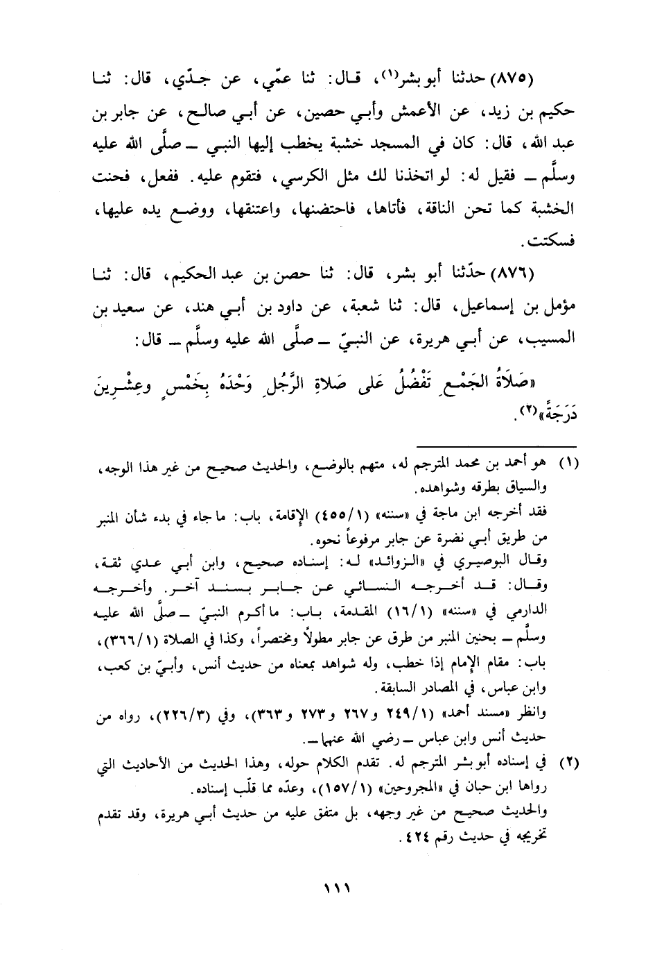حَدَّثَنَا أَبُو بِشْرٍ , قال: ثنا عَمِّي , عَنْ جَدِّي , قال: ثنا حَكِيمُ بْنُ زَيْد ٍ , عَنِ الأَعْمَشِ , وَأَبِي حُصَيْن ٍ , عَنْ أَبِي صَالِحٍ , عَنْ جَابِرِ بْنِ عَبْدِ اللَّهِ , قَالَ: " كَانَ فِي الْمَسْجِدِ خَشَبَةٌ يَخْطُبُ إِلَيْهَا النَّبِيُّ صَلَّى اللهُ عَلَيْهِ وَسَلَّمَ، فَقِيلَ لَهُ: لَوِ اتَّخَذْنَا لَكَ مِثْلَ الْكُرْسِيِّ، فَتَقُومُ عَلَيْهِ، §فَفَعَلَ، فَحَنَّتِ الْخَشَبَةُ كَمَا تَحِنُّ النَّاقَةُ، فَأَتَاهَا فَاحْتَضَنَهَا وَاعْتَنَقَهَا، وَوَضَعَ يَدَهُ عَلَيْهَا فَسَكَتَتْ "