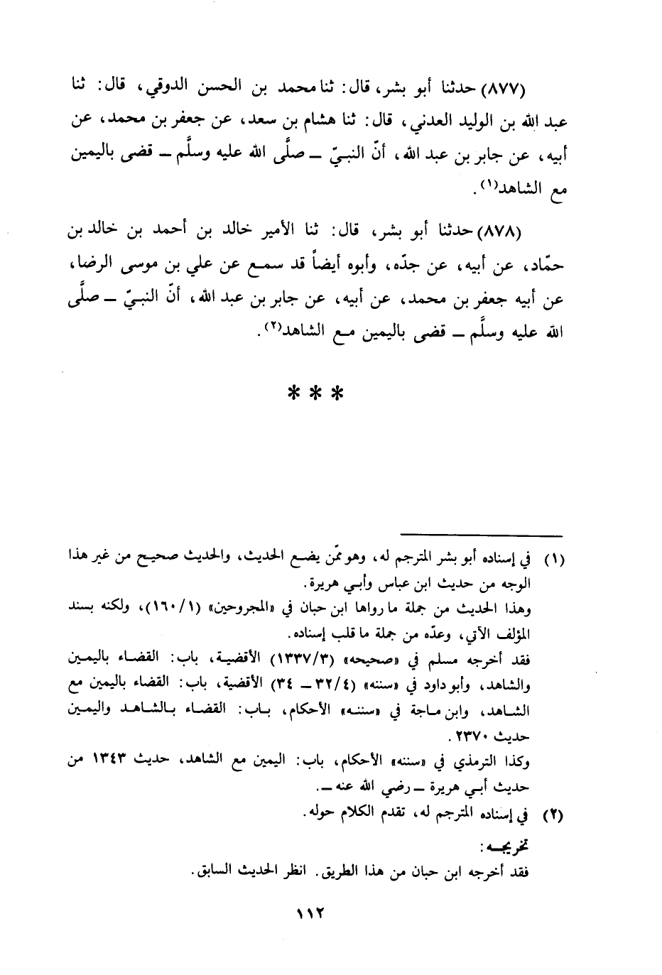 حَدَّثَنَا أَبُو بِشْرٍ , قال: ثنا الأَمِيرُ خَالِدُ بْنُ أَحْمَدَ بْنِ خَالِدِ بْنِ حَمَّاد ٍ , عَنْ أَبِيهِ , عَنْ جَدِّهِ , وَأَبُوهُ أَيْضًا، قَدْ سَمِعَ عَنَ عَلِيِّ بْنِ مُوسَى الرِّضَا , عَنْ أَبِيهِ , جَعْفَرِ بْنِ مُحَمَّد ٍ , عَنْ أَبِيهِ , عَنْ جَابِرِ بْنِ عَبْدِ اللَّهِ , «أَنّ النَّبِيَّ صَلَّى اللهُ عَلَيْهِ وَسَلَّمَ §قَضَى بِالْيَمِينِ مَعَ الشَّاهِدِ»