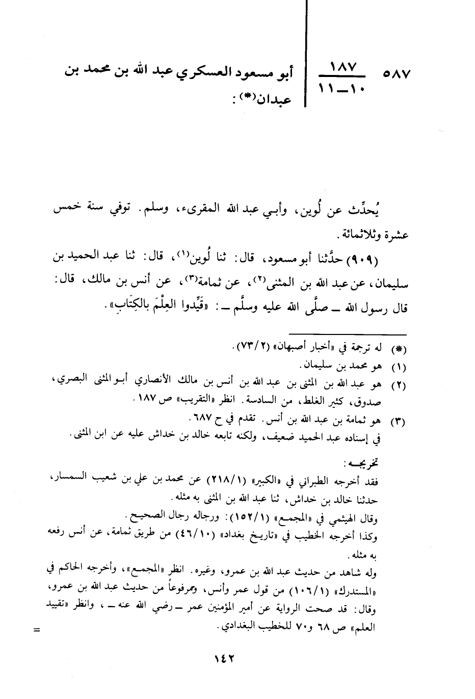حَدَّثَنَا أَبُو مَسْعُودٍ , قال: ثنا لُوَيْن ٌ , قال: ثنا عَبْدُ الْحَمِيدِ بْنُ سُلَيْمَانَ , عَنْ عَبْدِ اللَّهِ بْنِ الْمُثَنَّى , عَنْ ثُمَامَةَ , عَنْ أَنَسِ بْنِ مَالِكٍ , قَالَ: قَالَ رَسُولُ اللَّهِ صَلَّى اللهُ عَلَيْهِ وَسَلَّمَ: «§قَيِّدُوا الْعِلْمَ بِالْكِتَابِ»