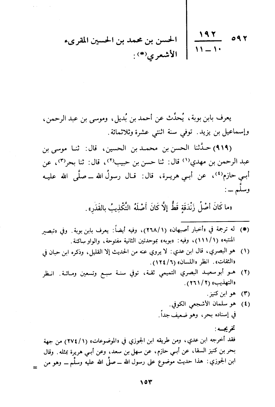حَدَّثَنَا الْحَسَنُ بْنُ مُحَمَّدِ بْنِ الْحُسَيْنِ , قال: ثنا مُوسَى بْنُ عَبْدِ الرَّحْمَنِ بْنِ مَهْدِي ٍّ , قال: ثنا حَسَنُ بْنُ حَبِيبٍ , قال: ثنا بَحْرٌ , عَنْ أَبِي حَازِمٍ , عَنْ أَبِي هُرَيْرَةَ , قَالَ: قَالَ رَسُولُ اللَّهِ صَلَّى اللهُ عَلَيْهِ وَسَلَّمَ: «§مَا كَانَ أَصْلُ زَنْدَقَةٍ قَطُّ إِلا كَانَ أَصْلُهُ التَّكْذِيبُ بِالْقَدَرِ»