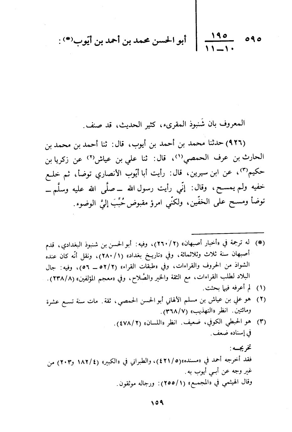 حَدَّثَنَا مُحَمَّدُ بْنُ أَحْمَدَ بْنِ أَيُّوبَ , قال: ثنا أَحْمَدُ بْنُ مُحَمَّدِ بْنِ الْحَارِثِ بْنِ عُرْوَةَ الْحِمْصِيُّ , قال: ثنا عَلِيُّ بْنُ عَيَّاشٍ , عَنْ زَكَرِيَّا بْنِ حَكِيم ٍ , عَنِ ابْنِ سِيرِينَ , قال: رَأَيْتُ أَبَا أَيُّوبَ الأَنْصَارِيَّ تَوَضَّأَ، ثُمَّ خَلَعَ خُفَّيْهِ وَلَمْ يَمْسَحْ , وَقَالَ: إِنِّي رَأَيْتُ رَأَيْتُ رَسُولَ اللَّهِ صَلَّى اللهُ عَلَيْهِ وَسَلَّمَ §تَوَضَّأَ وَمَسَحَ عَلَى الْخُفَّيْنِ "، وَلَكِنِّي امْرُؤٌ مَقْبُوضٌ حُبِّبَ إِلَيَّ الْوُضُوءُ