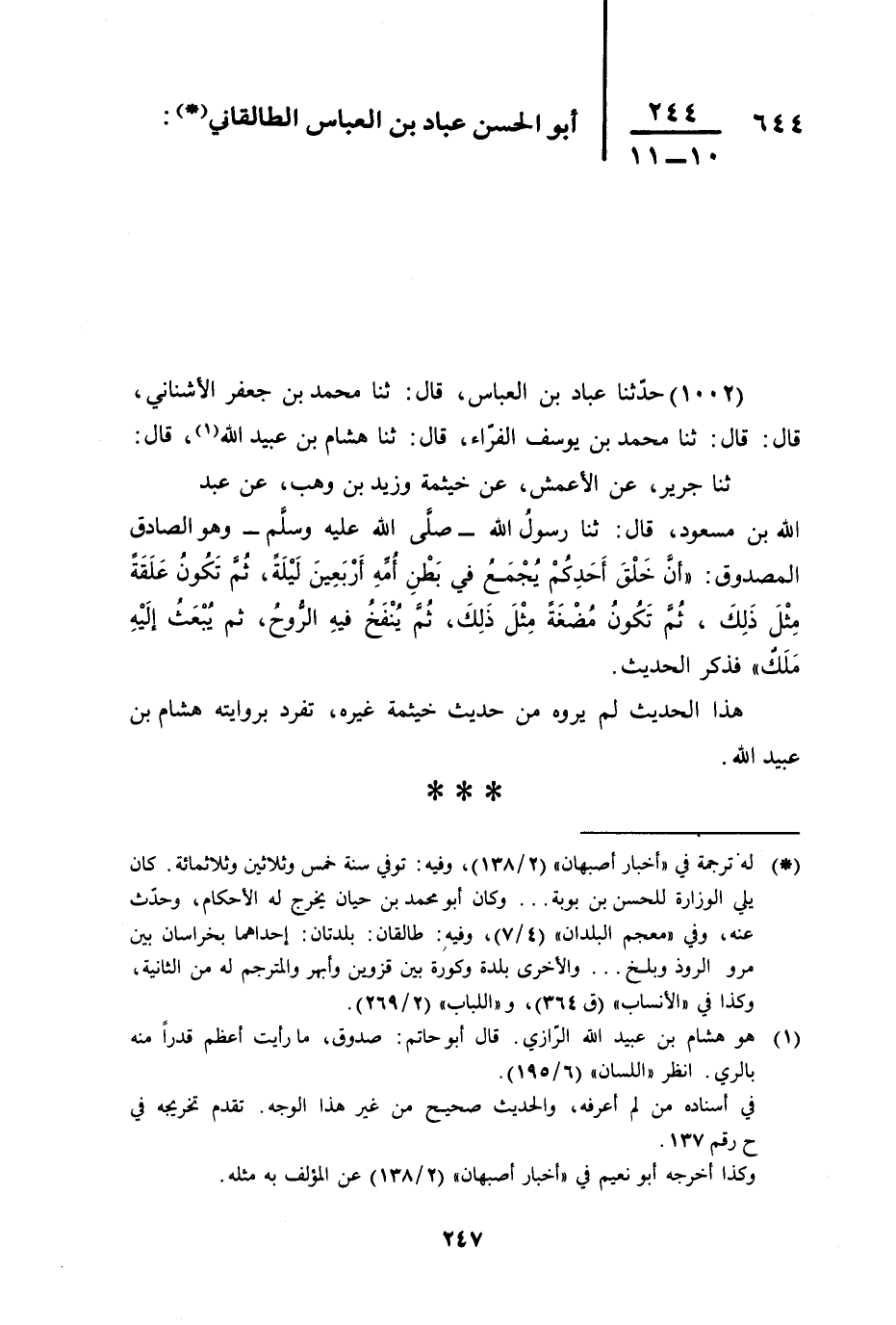 حَدَّثَنَا عَبَّادُ بْنُ الْعَبَّاسِ , قال: ثنا مُحَمَّدُ بْنُ جَعْفَرٍ الأَسْنَانِيّ ُ , قال: قال ثنا مُحَمَّدُ بْنُ يُوسُفَ الْفَرَّاءُ , قال: ثنا هِشَامُ بْنُ عُبَيْدِ اللَّه ِ , قال: ثنا جَرِيرٌ , عَنِ الأَعْمَشِ , عَنْ خَيْثَمَةَ , وَزَيْدِ بْنِ وَهْبٍ , عَنْ عَبْدِ اللَّهِ بْنِ مَسْعُودٍ , قَالَ: ثنا رَسُولُ اللَّهِ صَلَّى اللهُ عَلَيْهِ وَسَلَّمَ وَهُوَ الصَّادِقُ الْمَصْدُوقُ: «إنَّ §خَلْقَ أَحَدِكُمْ يُجْمَعُ فِي بَطْنِ أُمِّهِ أَرْبَعِينَ لَيْلَةً ثُمَّ تَكُونُ عَلَقَةً مِثْلَ ذَلِكَ، ثُمَّ تَكُونُ مُضْغَةً مِثْلَ ذَلِكَ، ثُمَّ يُنْفَخُ فِيهِ الرُّوحُ ثُمَّ، يُبْعَثُ إِلَيْهِ مَلَكٌ» ، فَذَكَرَ الْحَدِيثَ، هَذَا الْحَدِيثُ لَمْ يَرْوِهِ مِنْ حَدِيثِ خَيْثَمَةَ غَيْرُهُ، تَفَرَّدَ بِرِوَايَتِهِ هِشَامُ بْنُ عُبَيْدِ اللَّهِ