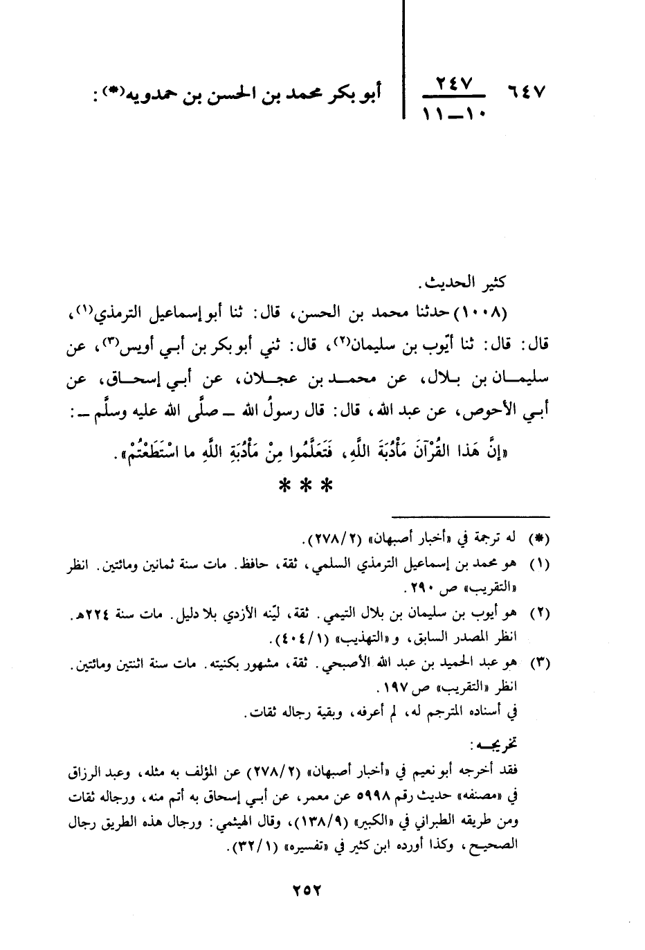 حَدَّثَنَا مُحَمَّدُ بْنُ الْحَسَنِ , قال: ثنا أَبُو إِسْمَاعِيلَ التِّرْمِذِيُّ , قال: ثنا أَيُّوبُ بْنُ سُلَيْمَانَ , قال: ثني أَبُو بَكْرِ بْنُ أَبِي أُوَيْسٍ , عَنْ سُلَيْمَانَ بْنِ بِلالٍ , عَنْ مُحَمَّدِ بْنِ عَجْلانَ , عَنْ أَبِي إِسْحَاقَ , عَنْ أَبِي الأَحْوَصِ , عَنْ عَبْدِ اللَّهِ , قَالَ: قَالَ رَسُولُ اللَّهِ صَلَّى اللهُ عَلَيْهِ وَسَلَّمَ: «إِنَّ §هَذَا الْقُرْآنَ مَأْدُبَةُ اللَّهِ , فَتَعَلَّمُوا مِنْ مَأْدُبَةِ اللَّهِ مَا اسْتَطَعْتُمْ»