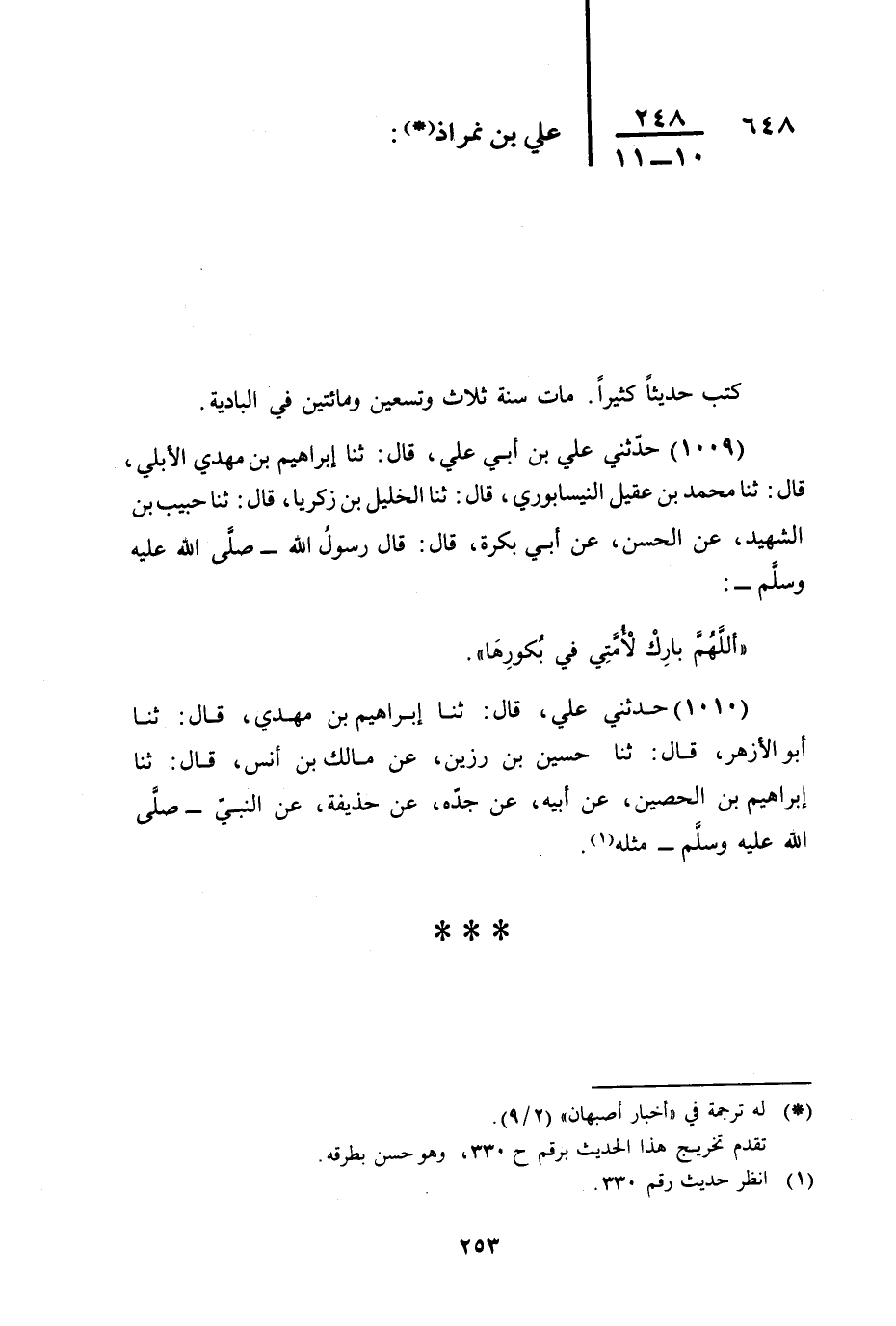 حَدَّثَنِي عَلِيُّ بْنُ أَبِي عَلِيٍّ , قال: ثنا إِبْرَاهِيمُ بْنُ مَهْدِيٍّ الأَيْلِيُّ , قال: ثنا مُحَمَّدُ بْنُ عَقِيلٍ النَّيْسَابُورِيُّ , قال: ثنا الْخَلِيلُ بْنُ زَكَرِيَّا , قال: ثنا حَبِيبُ بْنُ الشَّهِيدِ , عَنِ الْحَسَنِ , عَنْ أَبِي بَكْرَةَ , قَالَ: قَالَ رَسُولُ اللَّهِ صَلَّى اللهُ عَلَيْهِ وَسَلَّمَ: «§اللَّهُمَّ بَارِكْ لِأُمَّتِي فِي بُكُورِهَا» ، حَدَّثَنِي عَلِيٌّ , قَالَ: ثنا إِبْرَاهِيمُ بْنُ مَهْدِيِّ , قَالَ: ثنا أَبُو الأَزْهَرِ , قَالَ: ثنا حُسَيْنُ بْنُ رَزِينٍ , عَنْ مَالِكِ بْنِ أَنَسٍ , قَالَ: ثنا إِبْرَاهِيمُ بْنُ الْحُصَيْنِ , عَنْ أَبِيهِ , عَنْ جَدِّهِ , عَنْ حُذَيْفَةَ , عَنِ النَّبِيِّ صَلَّى اللهُ عَلَيْهِ وَسَلَّمَ , مِثْلَهُ
