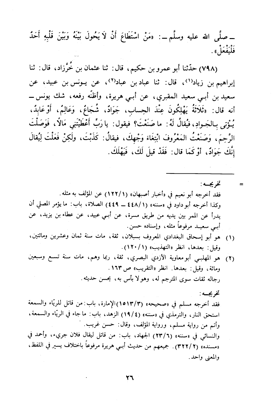 حَدَّثَنَا أَبُو عَمْرِو بْنُ حَكِيمٍ , قال: ثنا عُثْمَانُ بْنُ خَرَّزَادَ , قال: ثنا إِبْرَاهِيمُ بْنُ زِيَادٍ , قال: ثنا عَبَّادُ بْنُ عَبَّادٍ , عَنْ يُونُسَ بْنِ عُبَيْدٍ، عَنْ سَعِيدِ بْنِ أَبِي سَعِيدٍ الْمَقْبُرِيِّ , عَنْ أَبِي هُرَيْرَةَ , وَأَظُنُّهُ رَفَعَهُ شَكَّ يُونُسُ، أَنَّهُ قَالَ: " §ثَلاثَةٌ يَهْلِكُونَ عِنْدَ الْحِسَابِ: جَوَادٌ شُجَاعٌ , وَعَالِمٌ , أَوْ عَابِدٌ يُؤْتَى بِالْجَوَّادِ، فَيُقَالُ لَهُ: مَا صَنَعْتَ؟ فَيَقُولُ: يَا رَبِّ أَعْطَيْتَنِي مَالا، فَوَصَلْتُ الرَّحِمَ، وَصَنَعْتُ الْمَعْرُوفَ ابْتِغَاءَ وَجْهِكَ , فَيُقَالُ: كَذَبْتَ , وَلَكِنْ فَعَلْتَ، لِيُقَالَ إِنَّكَ جَوَّادٌ، أَوْ كَمَا قَالَ، فَقَدْ قِيلَ لَكَ، فَيَهْلِكَ ,