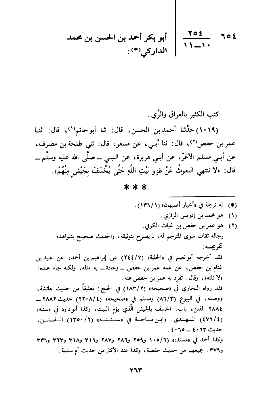 حَدَّثَنَا أَحْمَدُ بْنُ الْحَسَنِ , قال: ثنا أَبُو حَاتِمٍ , قال: ثنا عُمَرُ بْنُ حَفْصٍ , قال: ثنا أَبِي , عَنْ مِسْعَرٍ , قال: ثني طَلْحَةُ بْنُ مُصَرِّف ٍ , عَنْ أَبِي مُسْلِمٍ الأَغَرِّ عَنْ أَبِي هُرَيْرَةَ , عَنِ النَّبِيِّ صَلَّى اللهُ عَلَيْهِ وَسَلَّمَ، قَالَ: «§لا تَنْتَهِي الْبُعُوثُ عَنْ غَزْوِ بَيْتِ اللَّهِ , حَتَّى يُخْسَفَ بِجَيْشٍ مِنْهُمْ»