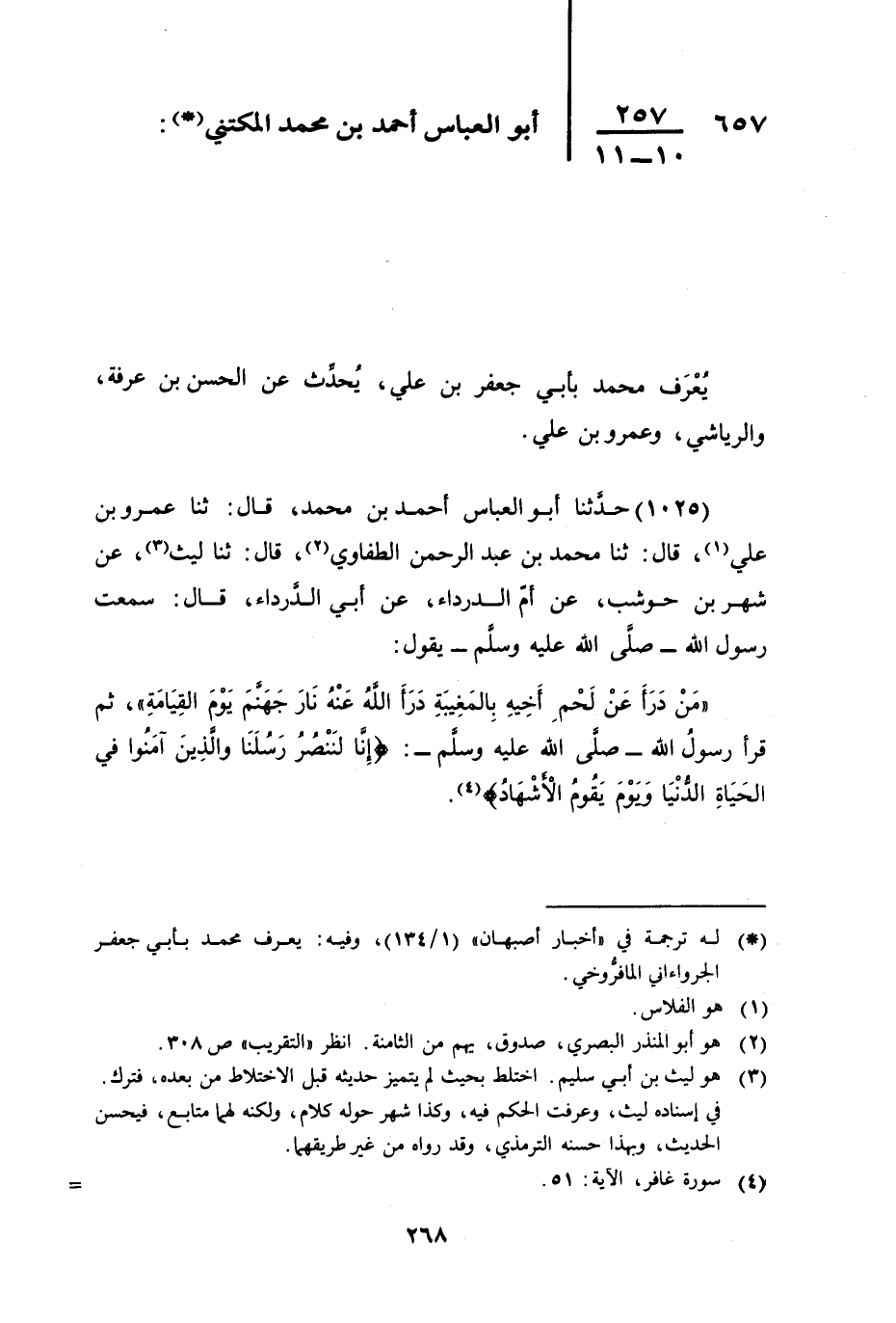 حَدَّثَنَا أَبُو الْعَبَّاسِ أَحْمَدُ بْنُ مُحَمَّدٍ , قال: ثنا عَمْرُو بْنُ عَلِيٍّ , قال: ثنا مُحَمَّدُ بْنُ عَبْدِ الرَّحْمَنِ الطُّفَاوِيُّ , قال: ثنا لَيْث ٌ , عَنْ شَهْرِ بْنِ حَوْشَبٍ , عَنْ أُمِّ الدَّرْدَاءِ , عَنْ أَبِي الدَّرْدَاءِ , قَالَ: سَمِعْتُ رَسُولَ اللَّهِ صَلَّى اللهُ عَلَيْهِ وَسَلَّمَ، يَقُولُ: «§مَنْ دَرَأَ عَنْ لَحْمِ أَخِيهِ بِالْمَغِيبَةِ , دَرَأَ اللَّهُ عَنْهُ نَارَ جَهَنَّمَ يَوْمَ الْقِيَامَةِ» ، ثُمَّ قَرَأَ رَسُولُ اللَّهِ صَلَّى اللهُ عَلَيْهِ وَسَلَّمَ: {إِنَّا لَنَنْصُرُ رُسُلَنَا وَالَّذِينَ آمَنُوا فِي الْحَيَاةِ الدُّنْيَا وَيَوْمَ يَقُومُ الأَشْهَادُ} [غافر: 51] "