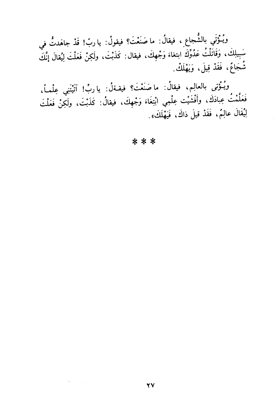 وَيُؤْتَى بِالشُّجَاعِ، فَيُقَالُ: مَا صَنَعْتَ؟ فَيَقُولُ: يَا رَبِّ قَدْ جَاهَدْتُ فِي سَبِيلِكَ، وَقَاتَلْتُ عَدُوَّكَ ابْتِغَاءَ وَجْهِكَ، فَيُقَالُ: كَذَبْتَ , وَلَكِنْ فَعَلْتَ لِيُقَالَ إِنَّكَ شُجَاعٌ، فَقَدْ قِيلَ، وَيَهْلِكَ , وَيُؤْتَى بِالْعَالِمِ، فَيُقَالُ: مَا صَنَعْتَ؟ فَيَقُولُ: يَا رَبِّ آتَيْتَنِي عِلْمًا فَعَلَّمْتُ عِبَادَكَ، وَأَفْشَيْتُ عِلْمِي ابْتِغَاءَ وَجْهِكَ، فَيُقَالُ: كَذَبْتَ , وَلَكِنْ فَعَلْتَ، لِيُقَالَ عَالِمٌ، فَقَدْ قِيلَ ذَاكَ، فَيَهْلِكَ "