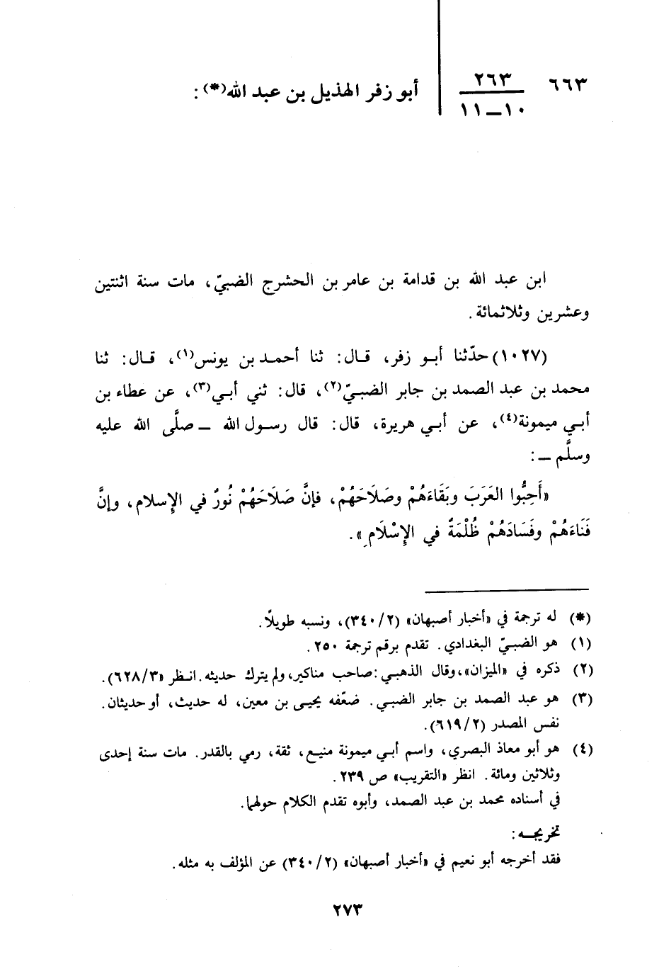 حَدَّثَنَا أَبُو زُفَرٍ , قال: ثنا أَحْمَدُ بْنُ يُونُس َ , قال: ثنا مُحَمَّدُ بْنُ عَبْدِ الصَّمَدِ بْنِ جَابِرٍ الضَّبِّيُّ , قال: ثني أَبِي , عَنْ عَطَاءِ بْنِ أَبِي مَيْمُونَةَ , عَنْ أَبِي هُرَيْرَةَ , قَالَ: قَالَ رَسُولُ اللَّهِ صَلَّى اللهُ عَلَيْهِ وَسَلَّمَ: «§أَحِبُّوا الْعَرَبَ وَبَقَاءَهُمْ وَصَلاحَهُمْ , فَإِنَّ صَلاحَهُمْ نُورٌ فِي الإِسْلامِ , وَإِنَّ فِنَاءَهُمْ وَفَسَادَهُمْ ظُلْمَةٌ فِي الإِسْلامِ»