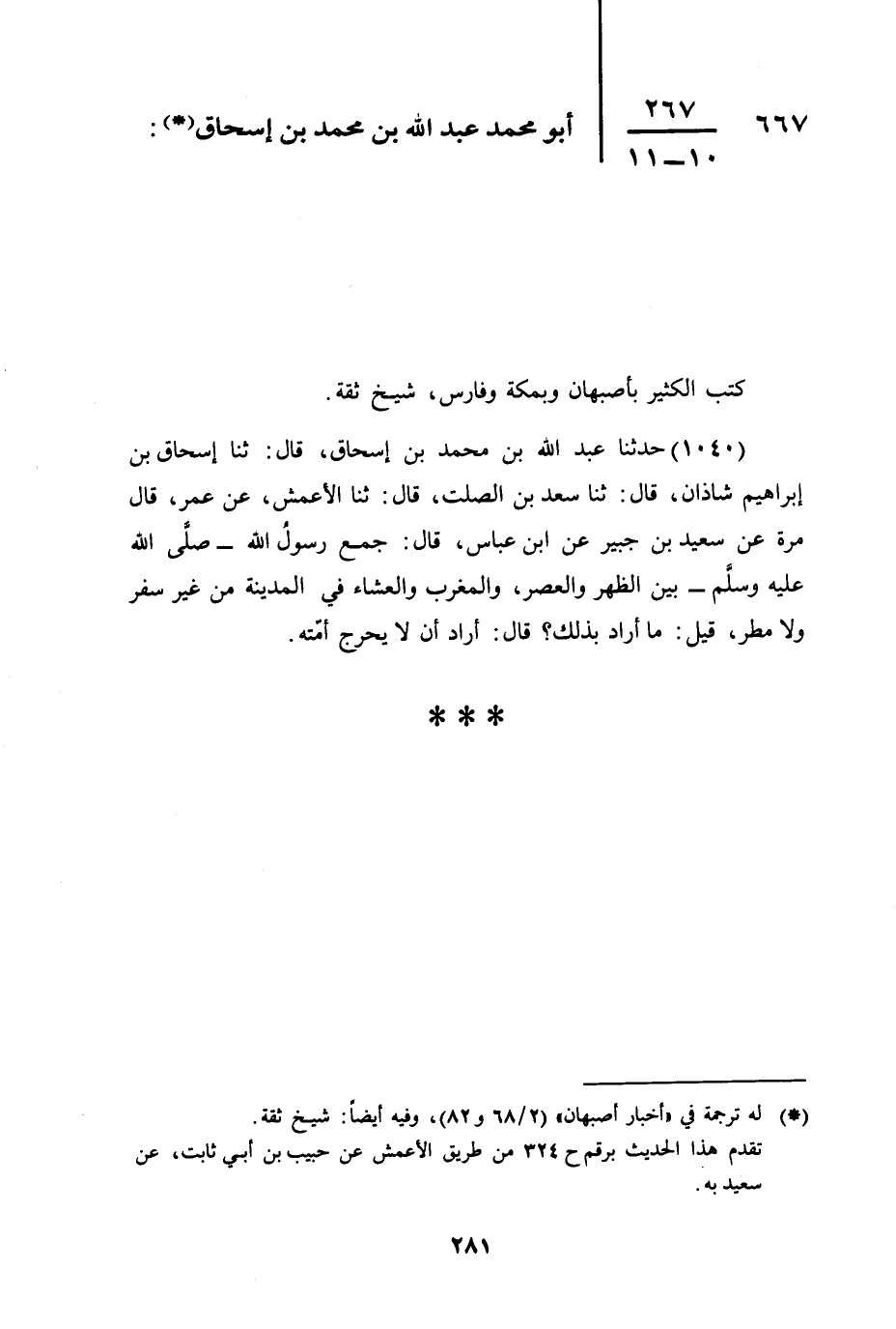 حَدَّثَنَا عَبْدُ اللَّهِ بْنُ مُحَمَّدِ بْنِ إِسْحَاقَ , قال: ثنا إِسْحَاقُ بْنُ إِبْرَاهِيمَ شَاذَانُ , قال: ثنا سَعْدُ بْنُ الصَّلْتِ , قال: ثنا الأَعْمَشُ , عَنْ عَمْرِو بْنِ مُرَّةَ عَنْ سَعِيدِ بْنِ جُبَيْرٍ , عَنِ ابْنِ عَبَّاسٍ , قَالَ: " §جَمَعَ رَسُولُ اللَّهِ صَلَّى اللهُ عَلَيْهِ وَسَلَّمَ بَيْنَ الظُّهْرِ وَالْعَصْرِ وَالْمَغْرِبِ وَالْعِشَاءِ فِي الْمَدِينَةِ مِنْ غَيْرِ سَفَرٍ وَلا مَطَرٍ، قِيلَ: مَا أَرَادَ بِذَلِكَ؟ قَالَ: أَرَادَ أَنْ لا يُحْرِجَ أُمَّتَهُ "