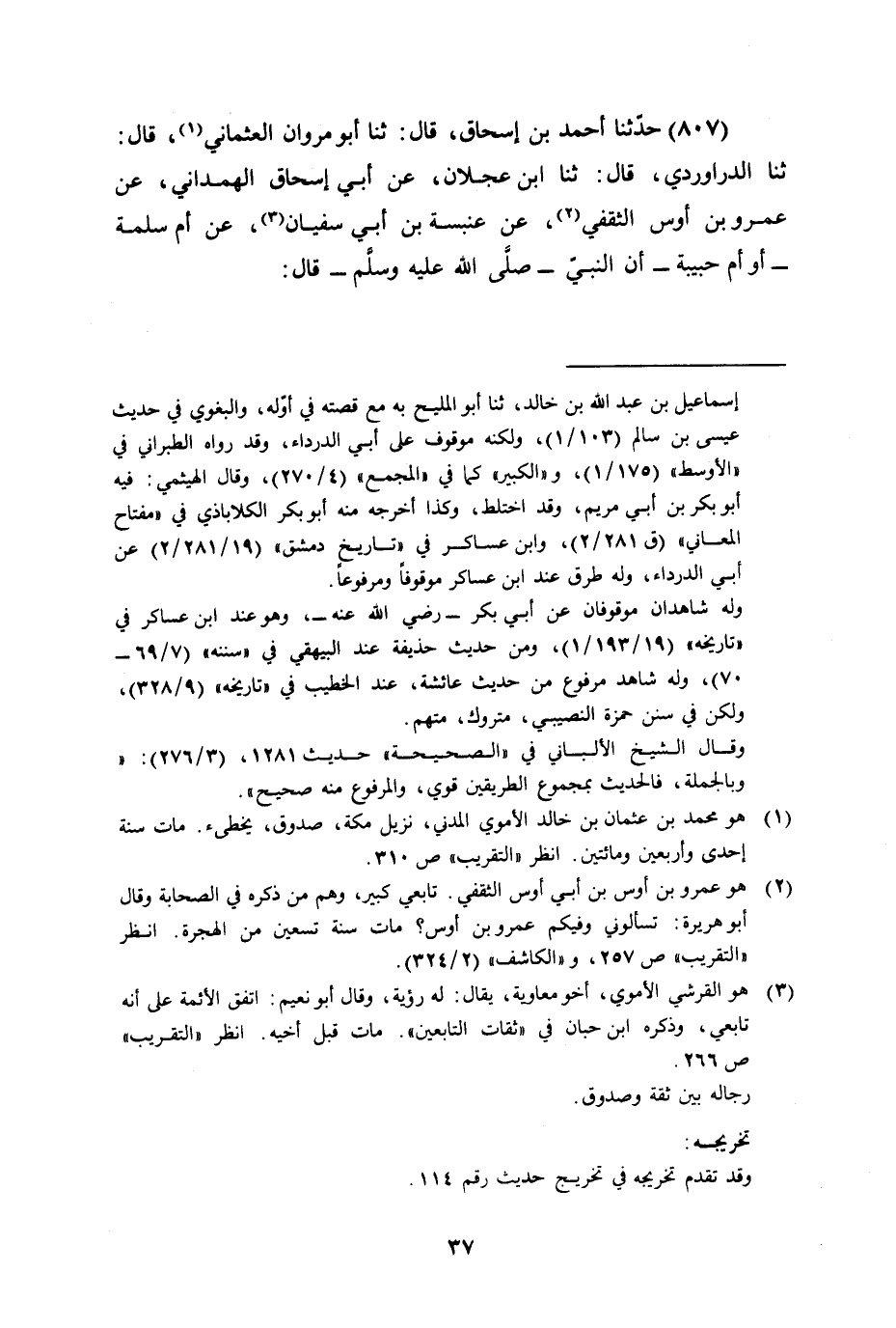 حَدَّثَنَا أَحْمَدُ بْنُ إِسْحَاقَ , قال: ثنا أَبُو مَرْوَانَ الْعُثْمَانِيُّ , قال: ثنا الدَّرَاوَرْدِيُّ , قال: ثنا ابْنُ عَجْلانَ , عَنْ أَبِي إِسْحَاقَ الْهَمْدَانِيِّ , عَنْ عَمْرِو بْنِ أَوْسٍ الثَّقَفِيِّ , عَنْ عَنْبَسَةَ بْنِ أَبِي سُفْيَانَ , عَنْ أُمِّ سَلَمَةَ , أَوْ أُمِّ حَبِيبَةَ , أَنّ النَّبِيَّ صَلَّى اللهُ عَلَيْهِ وَسَلَّمَ، قَالَ: " §مَنْ صَلَّى اثْنَتَيْ عَشْرَةَ رَكْعَةً فِي يَوْمٍ، بُنِيَ لَهُ بَيْتٌ فِي الْجَنَّةِ: أَرْبَعًا قَبْلَ الظُّهْرِ , وَرَكْعَتَيْنِ بَعْدَهَا , وَثِنْتَيْنِ قَبْلَ الْعَصْرِ , وَاثْنَتَيْنِ بَعْدَ الْمَغْرِبِ , وَاثْنَتَيْنِ قَبْلَ الصُّبْحِ "